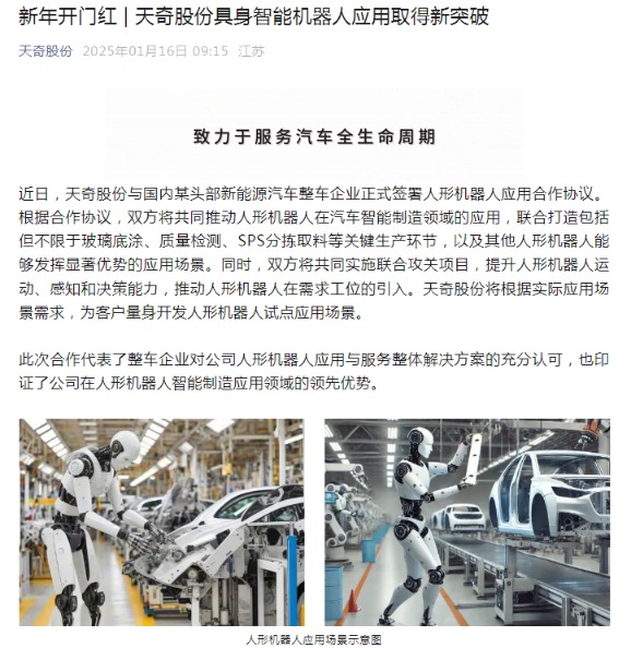 天奇股份具身智能机器人应用取得新突破