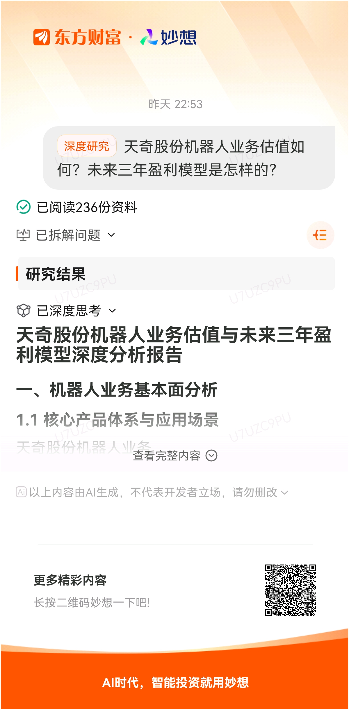 #@妙想,你怎么看?# 妙想一下:天奇股份机器人业务估值如何?未来三年盈利模型是怎样的?