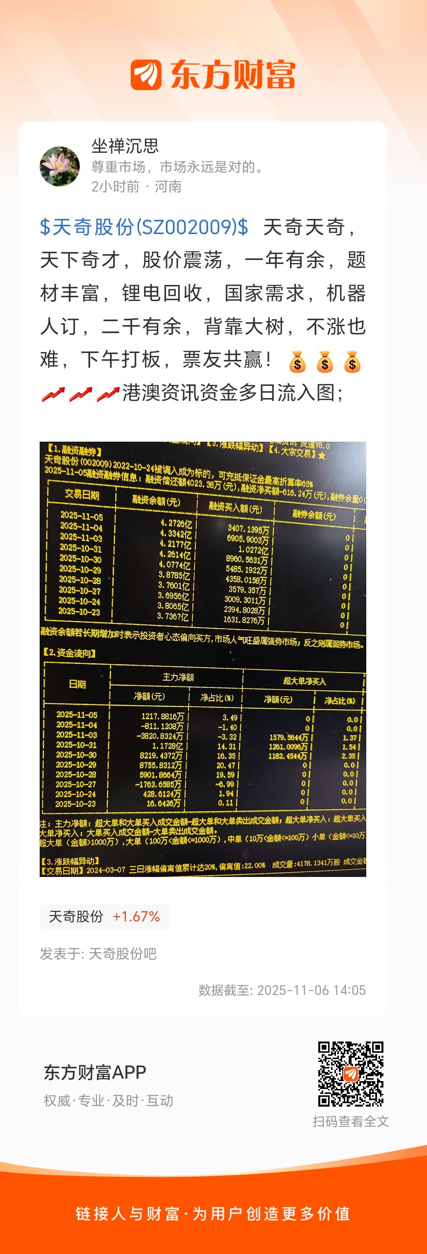 $天奇股份(SZ002009)$ 天奇天奇,天下奇才,股价震荡,一年有余,题材丰富,锂电回收,国家需求,机器人订,二千有余,背靠大树,不涨也难,下午打板,票友共赢!
