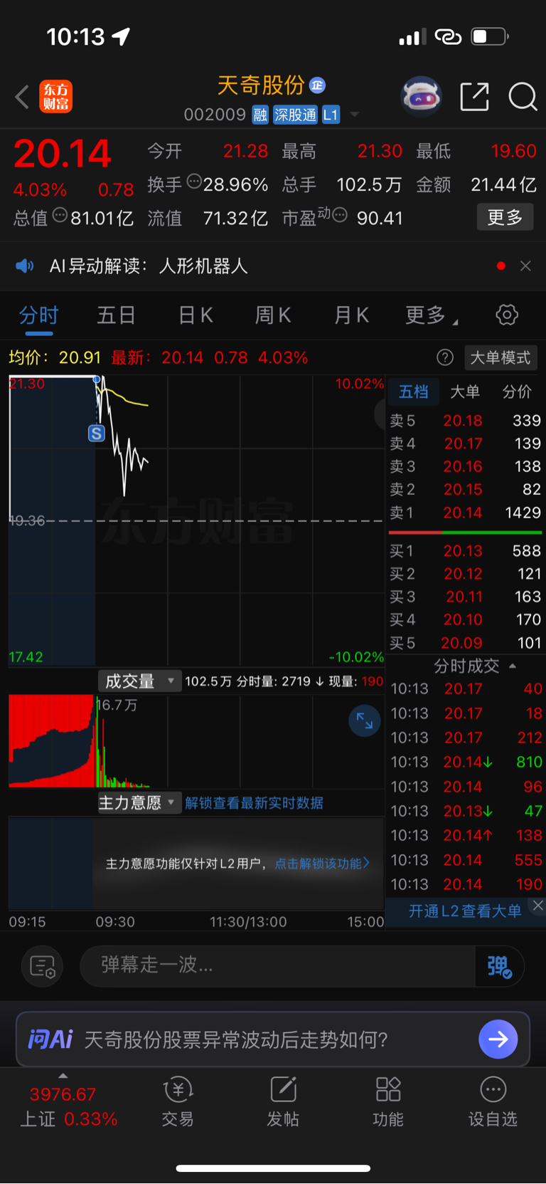 $天奇股份(SZ002009)$ 走了兄弟们,祝留下的发财,要是跌了我再买回来,不跌就错过了