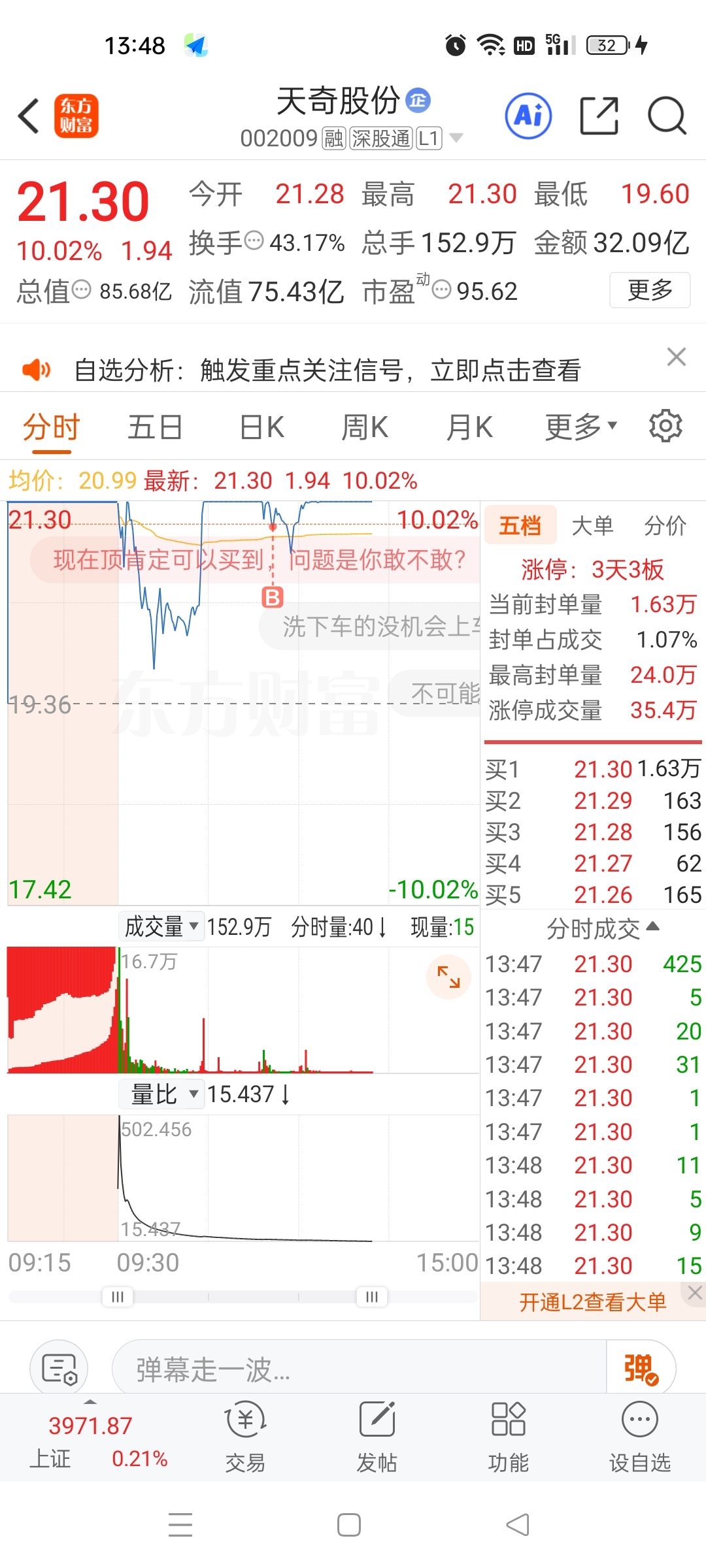 $天奇股份(SZ002009)$ 主力竞价高位放量V型,二次回封符合打板模式