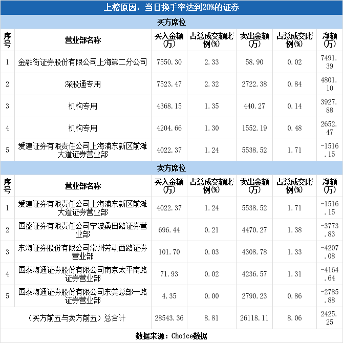 深交所2025年12月29日交易公开信息显示,天奇股份因属于当日换手率达到20%的证券而登上龙虎榜。天奇股份当日报收21.30元,涨跌幅为10.02%,换手率43.60%,振幅8.78%,成交额32.41亿元。