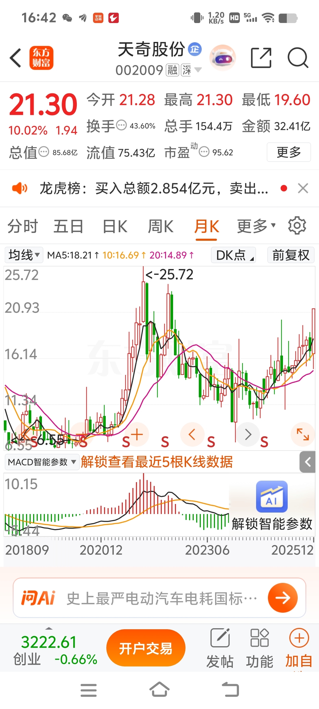 热烈祝贺天奇股份成功二晋级三成功,向锋龙看齐,跨年龙
