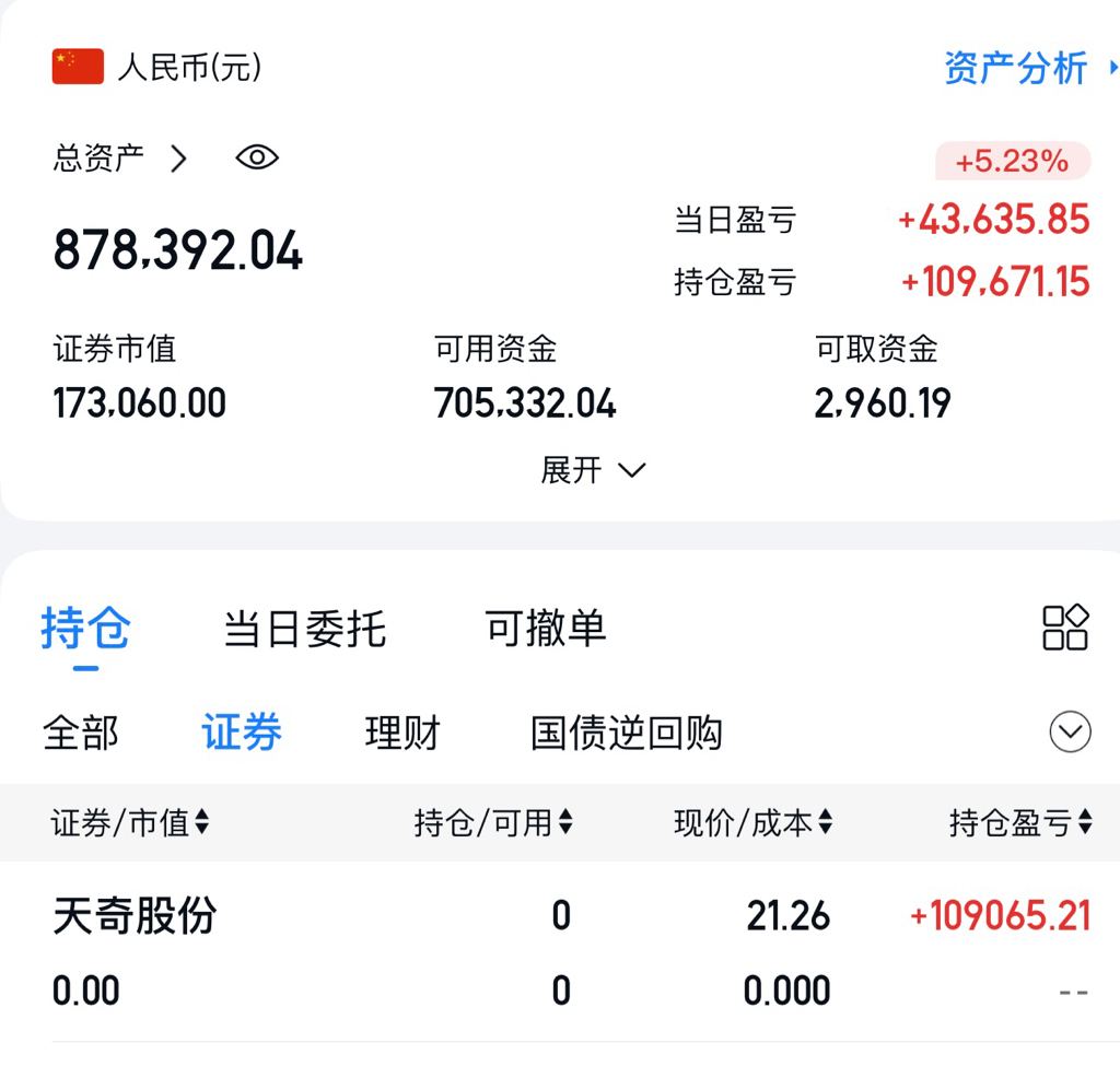 $天奇股份(SZ002009)$ 这只票拿了几个月了,永远不赚最后一个筹码,不在刀口上舔血,即便还有几个板也不会后悔#炒股日记#