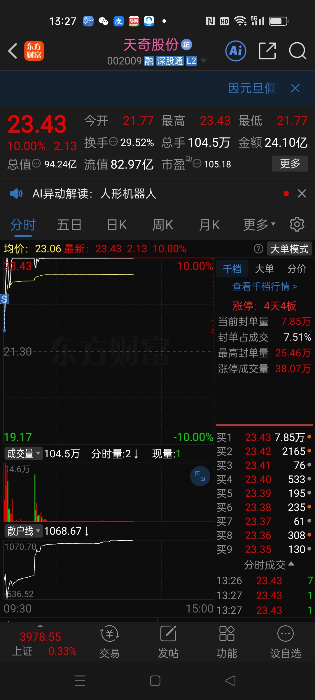 MD,早上竞价没有坚持最后几秒钟,被你吓跑了,干三花去,看来机器人要接替航天了!
