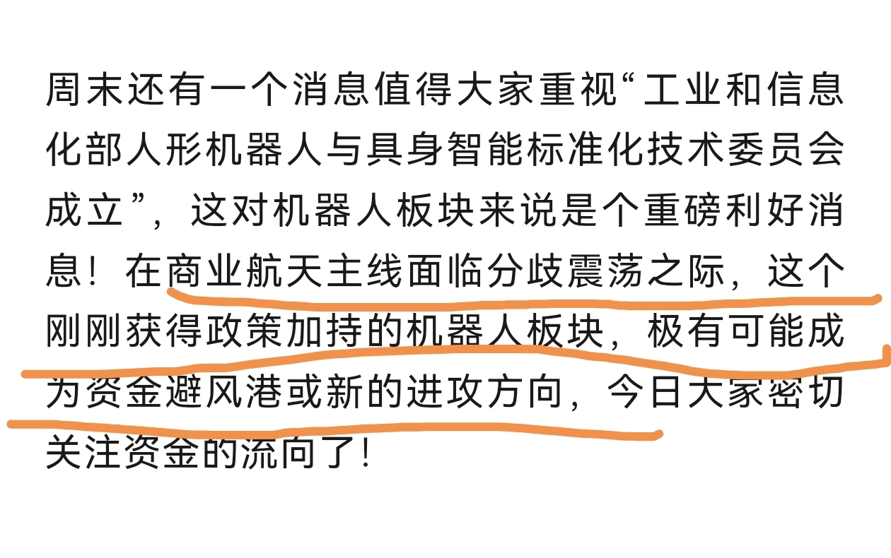 昨日,商业航天板块遭遇了明显的“退潮”,板块连板龙头神剑股份低开低走封死跌停,另一只板块总龙头航天发展则上演了“冲高大跳水”。这两只核心股的剧烈调整,直接给板块情绪踩了一脚“急刹车”,负反馈效应显著。与此同时,市场资金开始寻找新的突破口,机器人板块顺势崛起,昨日掀起了一片涨停潮,接住了从商业航天板块流出的活跃资金。其实前日的文章就已提醒过大家关注机器人板块,如果前日有提前布局,昨日就可以躺赢了。本人昨日早盘才把大部分仓位调到机器人个股(天奇股份、山子高科),希望自己能踏准节奏!