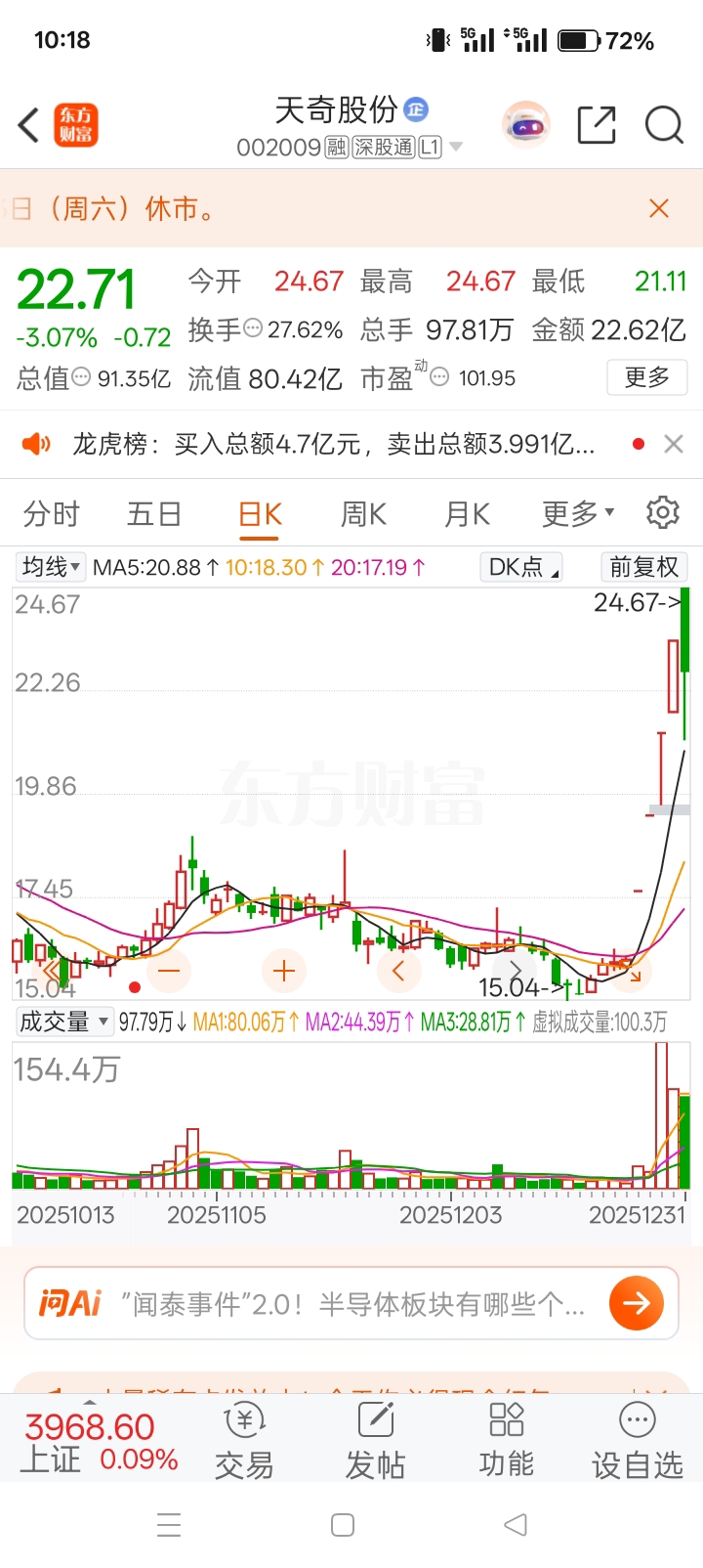 $天奇股份(SZ002009)$ 下影线出来,继续上车,吃肉