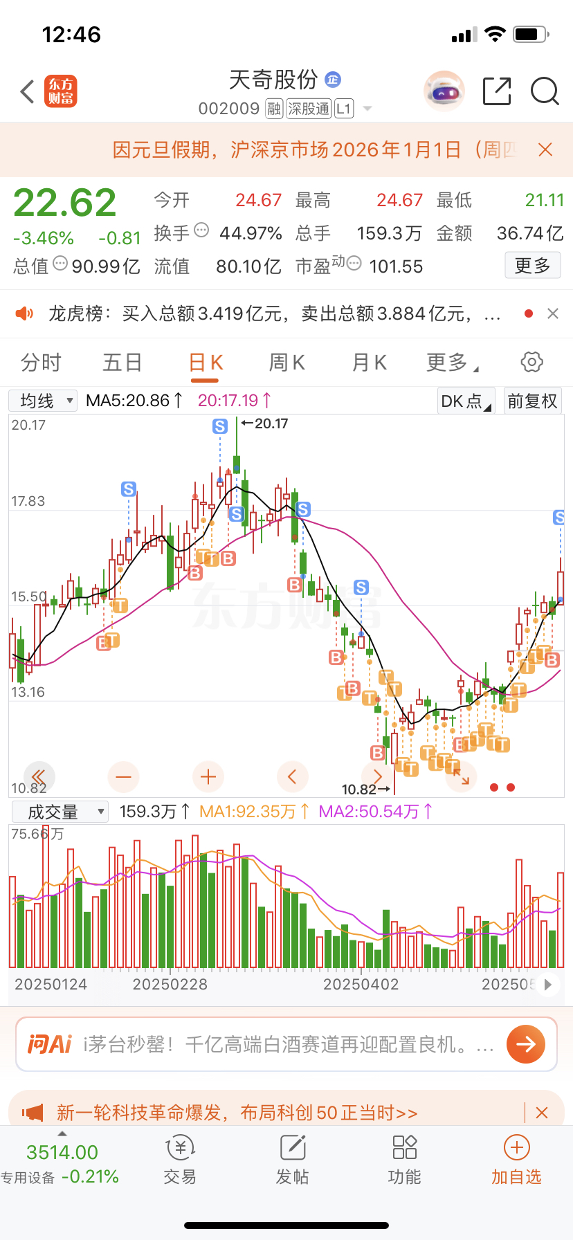 $天奇股份(SZ002009)$ 去年在天奇抗跌,做t小赚就跑了,如今看着天奇大涨!后悔没有一直在里面做t,一直做下去翻倍没问题!