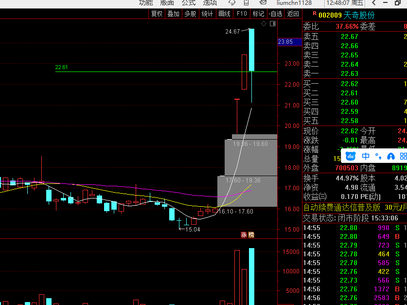 $天奇股份(SZ002009)$ 刚发现这个票,看主力周一给不给机会!这个票有意思了,看周一还会确认吗,如果周一再确认下不跌破22.61,果断上车,如果直接拉起又是一波,如果跌破果断下车,看主力周一给机会吗