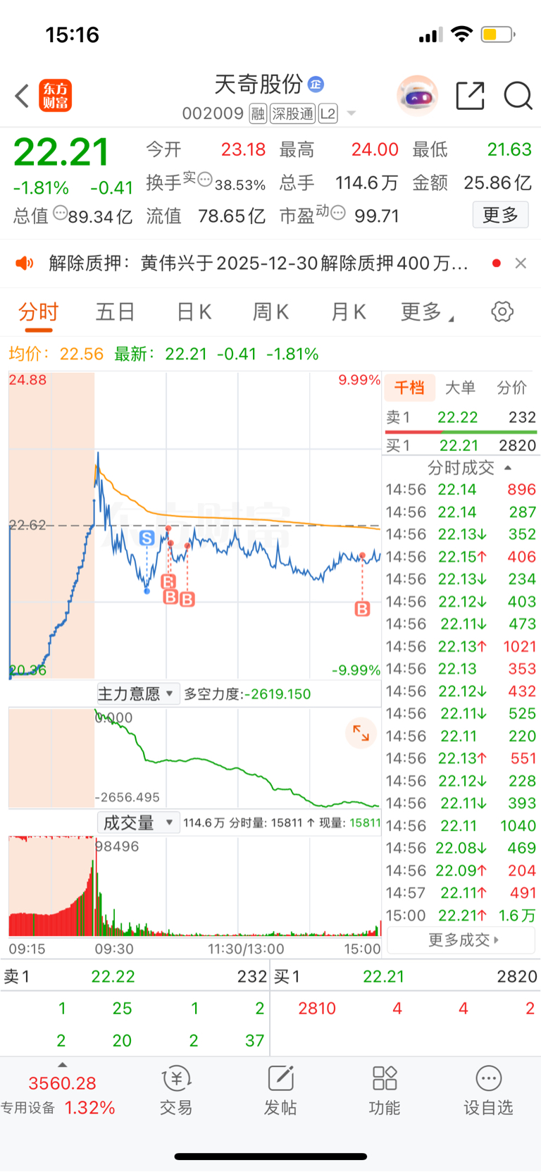 $天奇股份(SZ002009)$ 一觉醒来起晚了天塌了,赶紧卖了,不甘心又追了回来,今天属于半出货状态算止跌了吧我觉得,本身就看好还有预期,而且竞价属于相当看好反包了,看主力锁仓了,我尾盘全干进去了。哎,看着自己一天的操作也是醉了还是坚持初心不到30不卖持续看好。