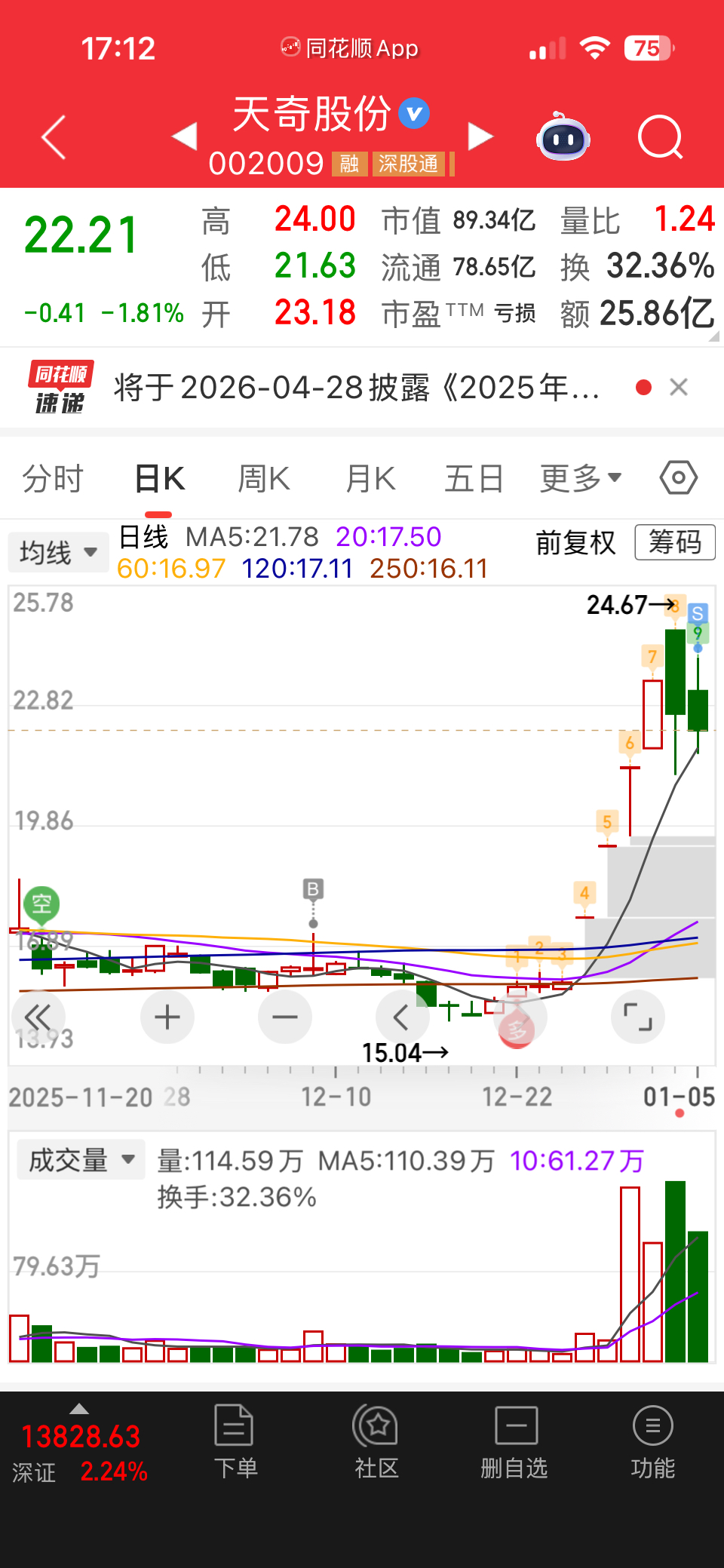 $天奇股份(SZ002009)$ 26年第一个交易日手里两个股票都跌了,亏钱日……,