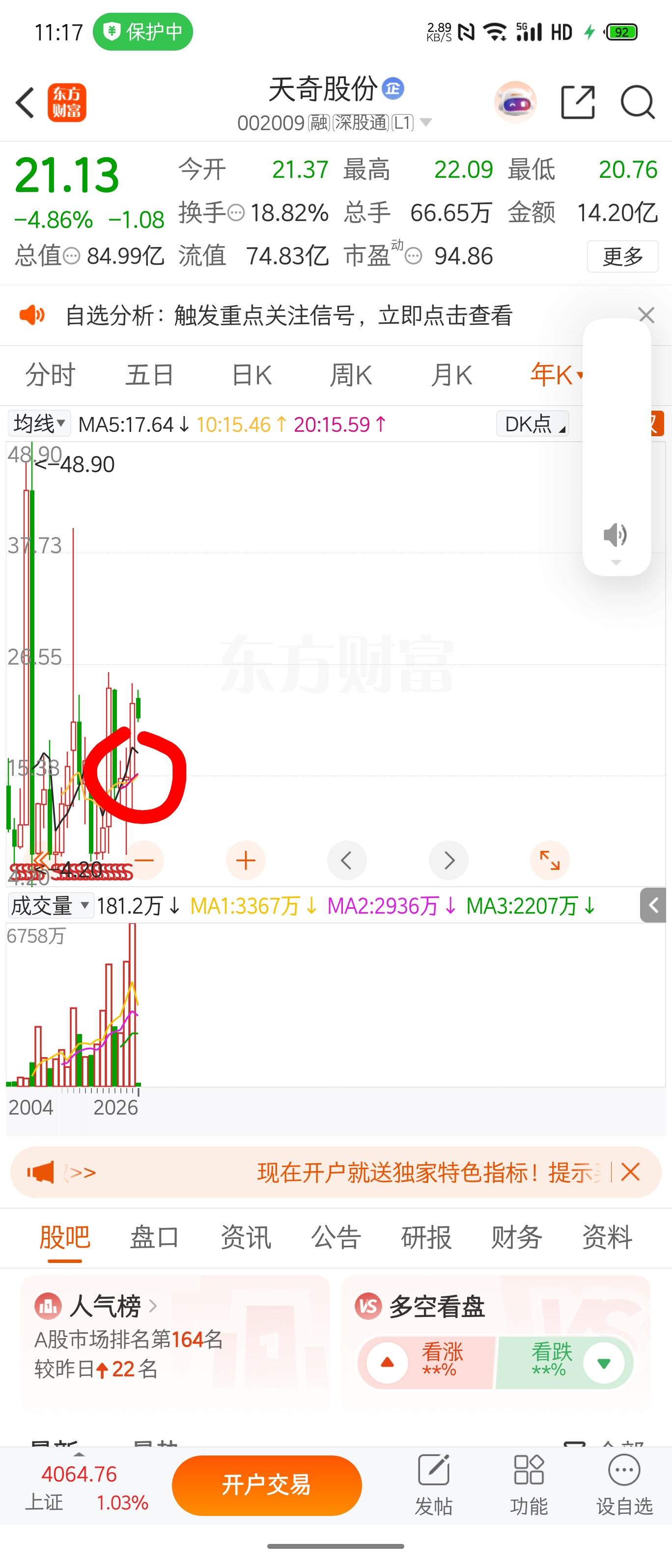 $天奇股份(SZ002009)$ 年线来看。需要跌倒黑线这个地方。