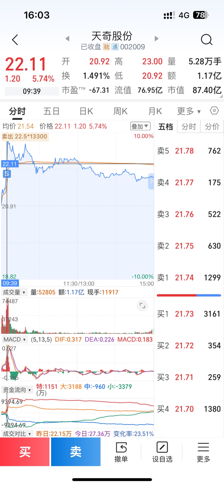 $天奇股份(SZ002009)$ 明天涨5-6个点,不说为啥,后面16个交易日股价会到359左右,大约70%以上的上涨空间,此贴不删,后面见证。