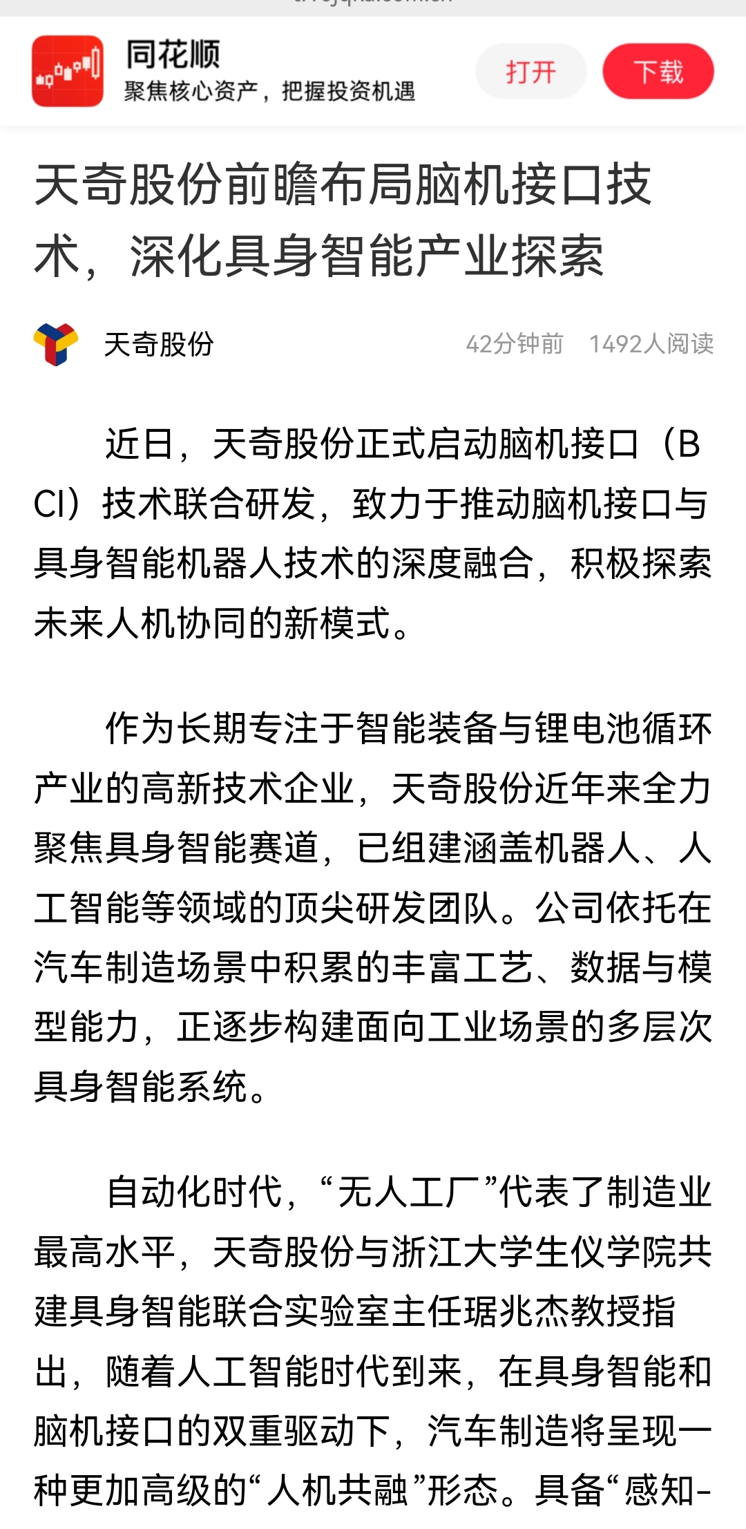 $天奇股份(SZ002009)$ 新增布局脑机接口技术与人形机器人融合。