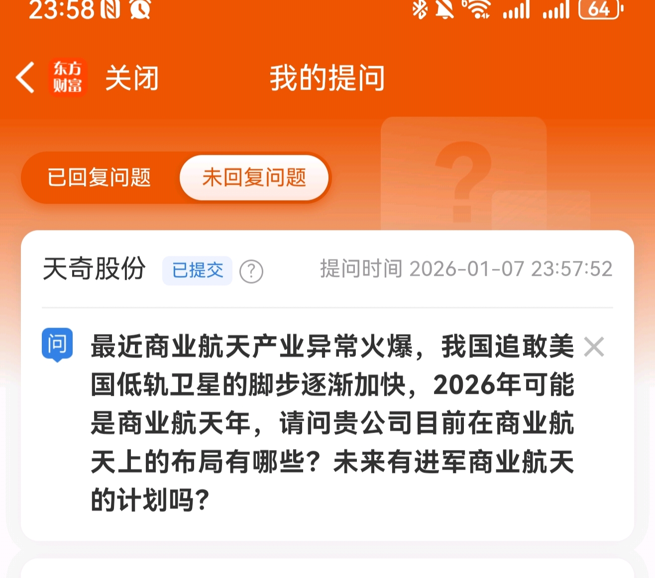 问下天奇董秘,公司有参与商业航天产业链吗?估计董秘也回答:公司正在积极研究相关行