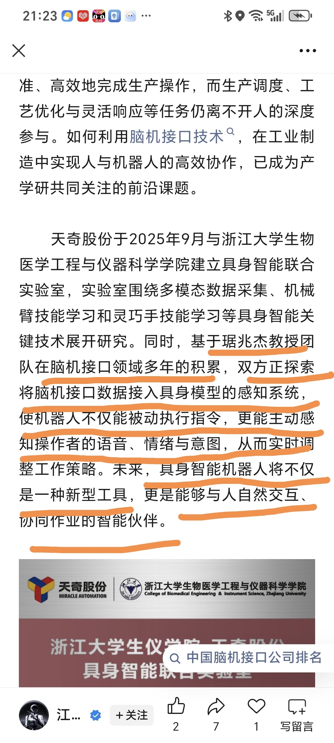 天奇股份脑机接口颠覆性应用!基于琚兆杰教授团队在脑机接口领域多年的积累,双方正探