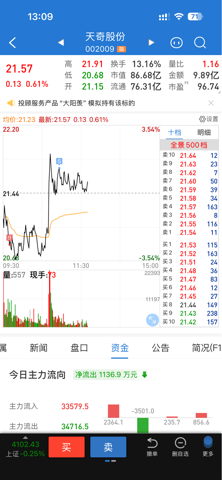 $天奇股份(SZ002009)$ 一天一千股做做T吧