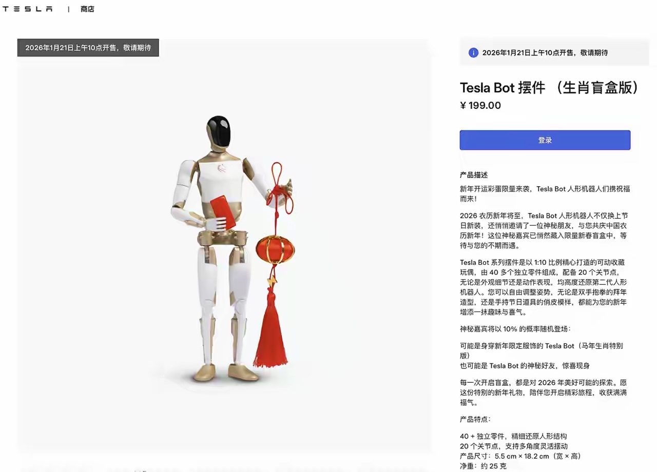 1月20日,特斯拉中国官网在线商店上架Tesla Bot摆件(生肖盲盒版),定价199元,将于1月21日10时开售。据介绍,该玩偶由40多个独立零件组成,配备20个关节点,均高度还原第二代人形机器人,产品尺寸为5.5cm×18.2cm,净重约25克。