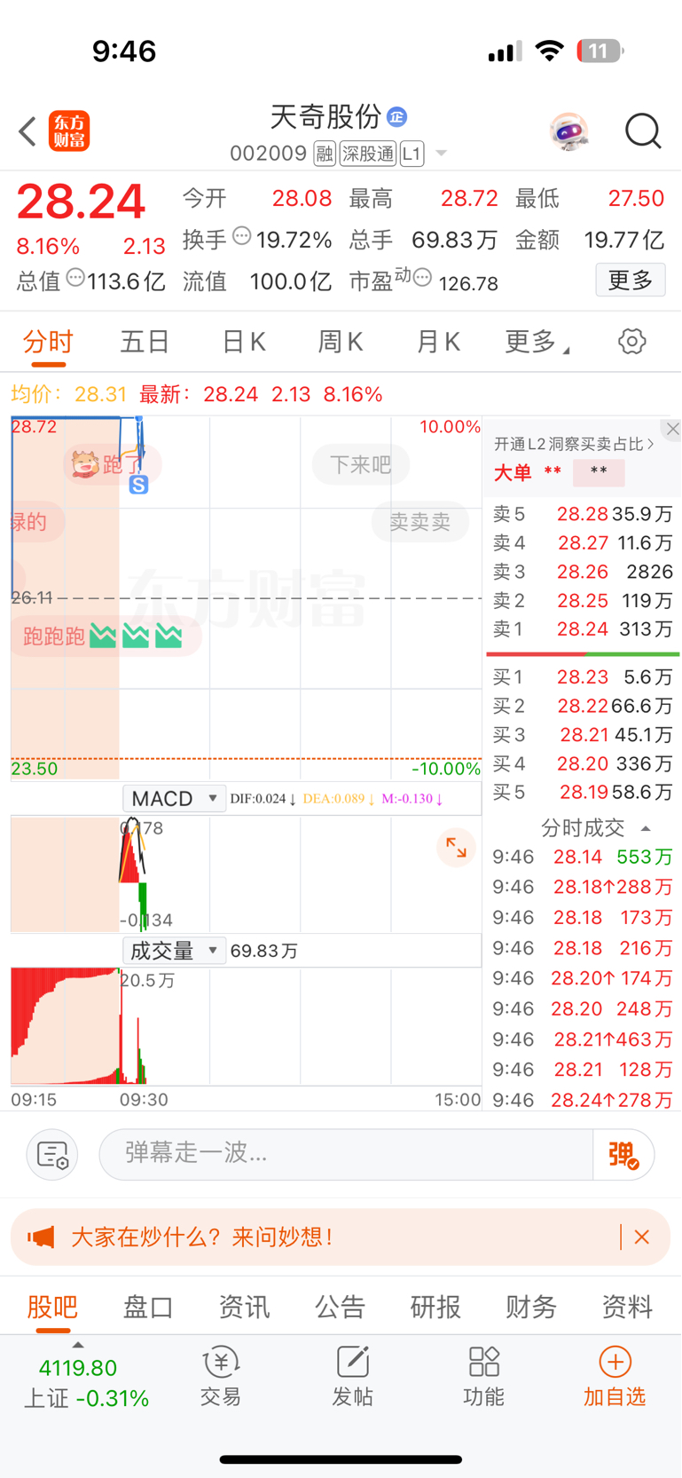 $天奇股份(SZ002009)$ 我走了,感谢主力哥。留下的兄弟们放心,今天肯定能回封。明天怎么开就不确定了,所以先走了。