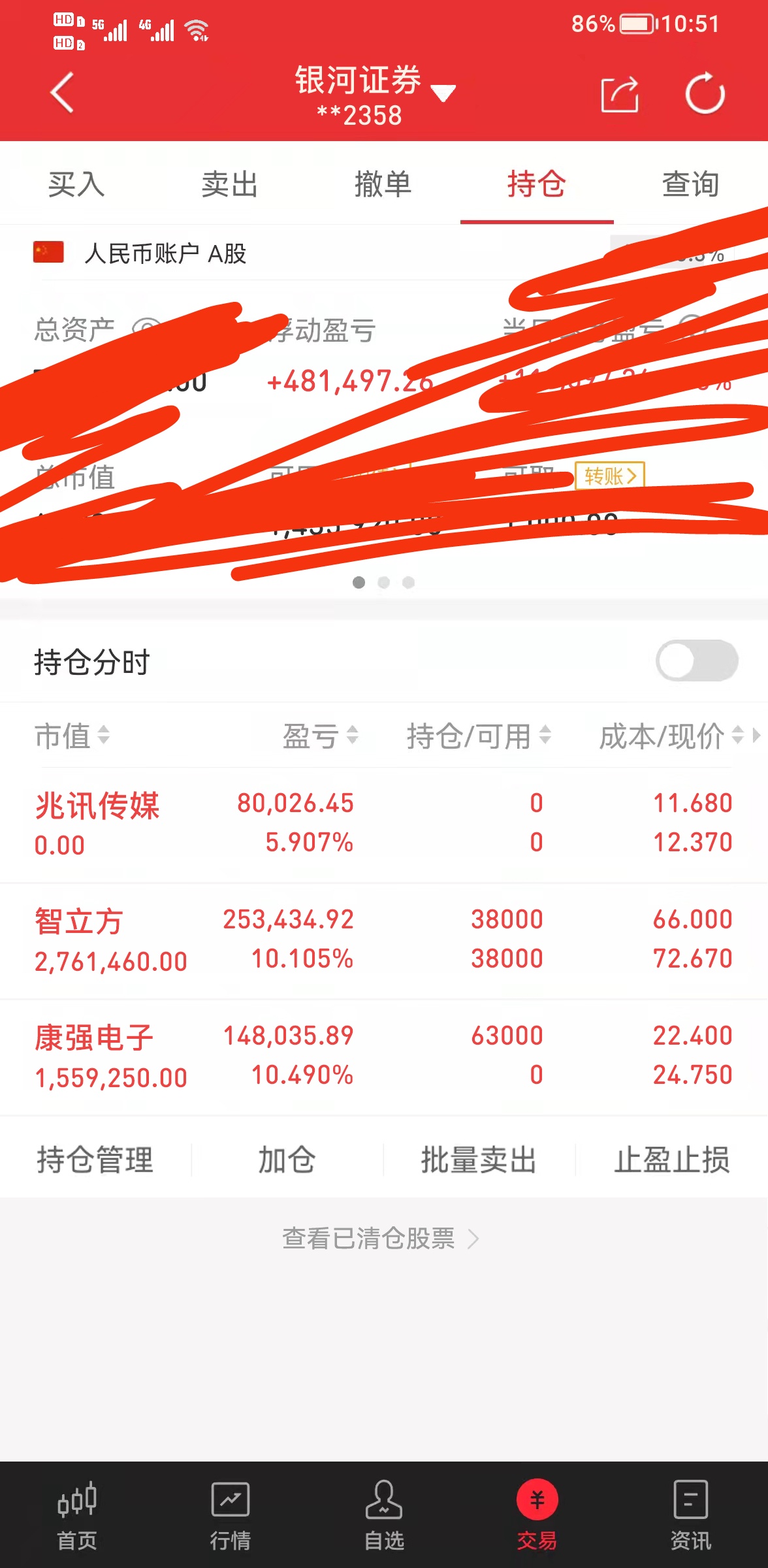 大家中午好,更新一下今日实盘。兆讯传媒止盈出局。智立方目前10cm继续持有,期待