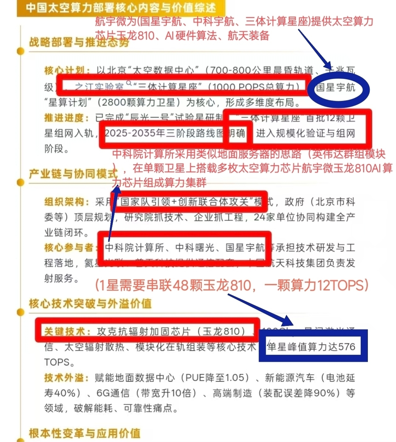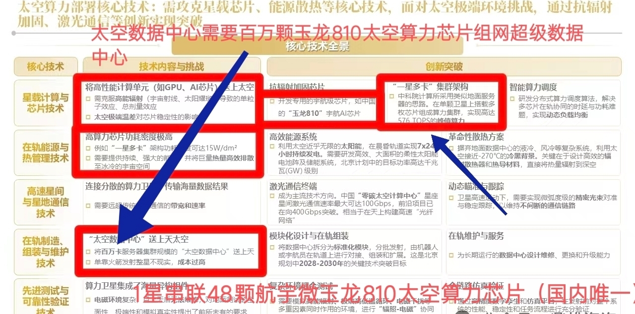 $紫金矿业(SH601899)$ $湖南白银(SZ002716)$ $航宇微(SZ300053)$ 太空算力大会核心"太空数据中心"送上太空,需将百万数量级算力卡(航宇微300053玉龙810AI算力芯片)发射亚轨道组网成太空超级算力中心,,一星多卡"(需要串联48颗玉龙810芯片,一颗算力12TOPS)集群架构解决算力大小问题(采用英伟达组群模式)中科院计算所采用类似地面服务器的思路。在单颗卫星上搭载多枚航宇微玉龙810AI芯片组成算力集群,实现高达576 TOPS的峰值算力,其实就是英伟达之前发布的超级算力模块儿