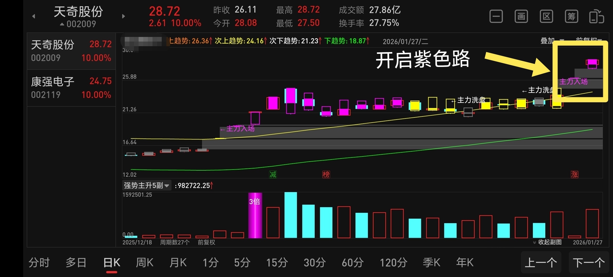 $天奇股份(SZ002009)$ 又成功斩获一只,一路紫,一路有!出了利欧之后这个可能是最大的肉!年前发个大红包!记录个人投资历程,观点不构成操作建议!