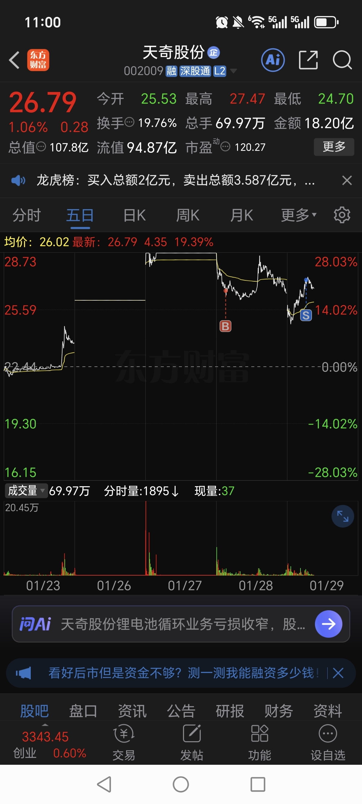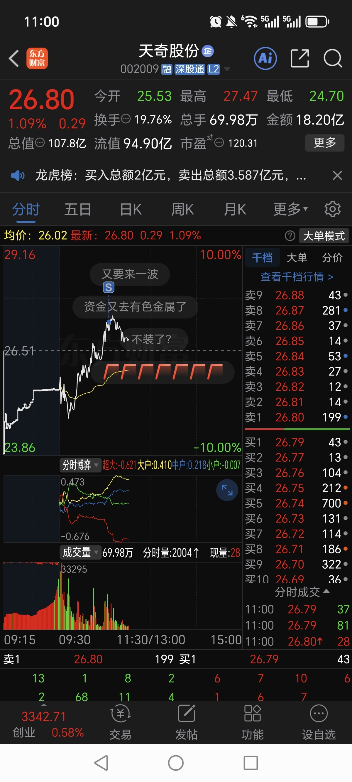 昨天26.64买的天奇股份,27.24已走,祝留下的发财