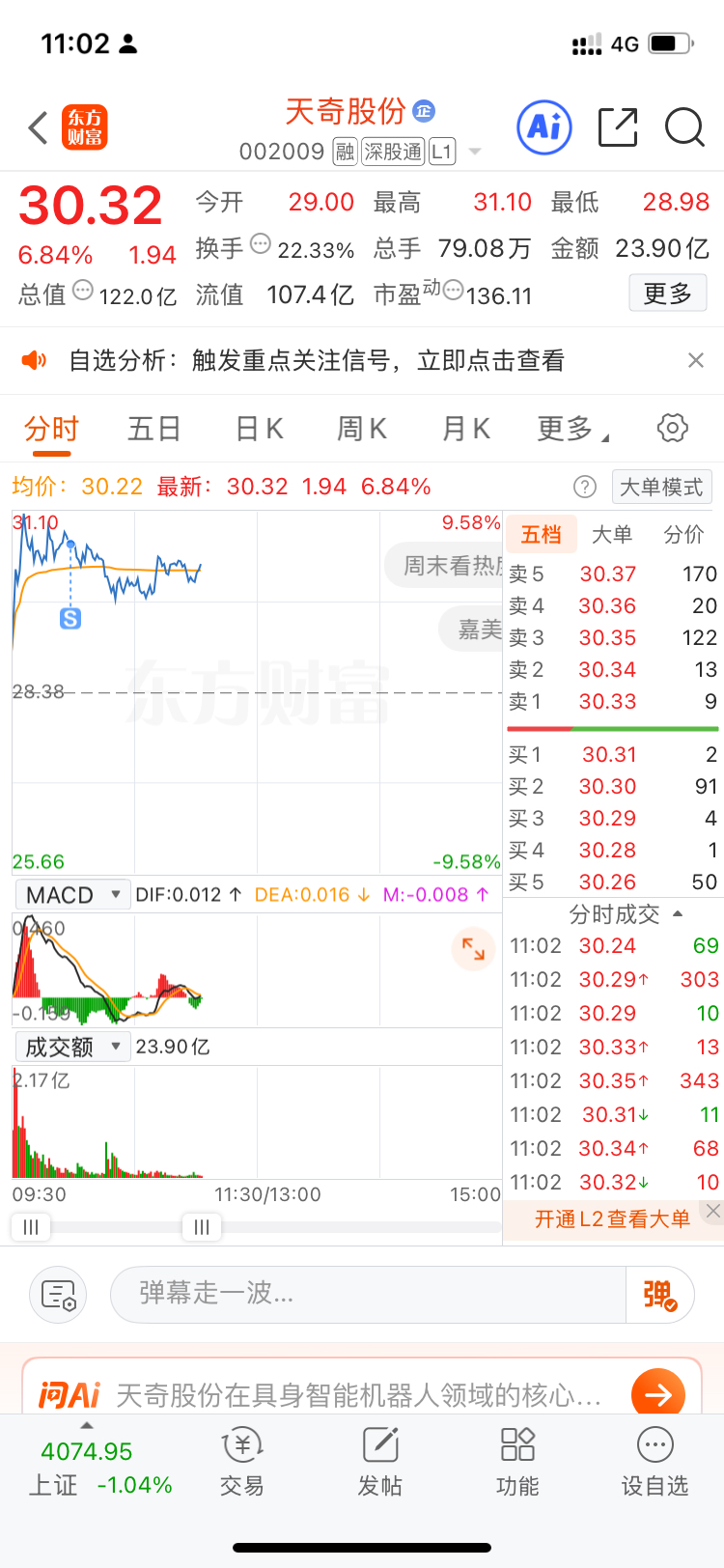 $天奇股份(SZ002009)$ 22个点到手,感谢主力