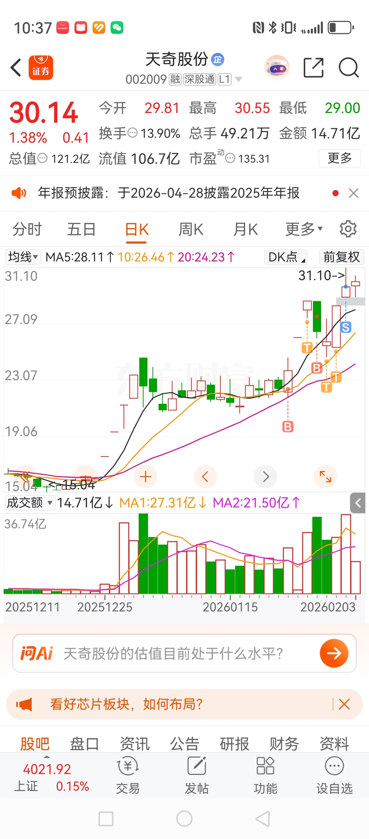 $天奇股份(SZ002009)$ 快下来,我还没接回去