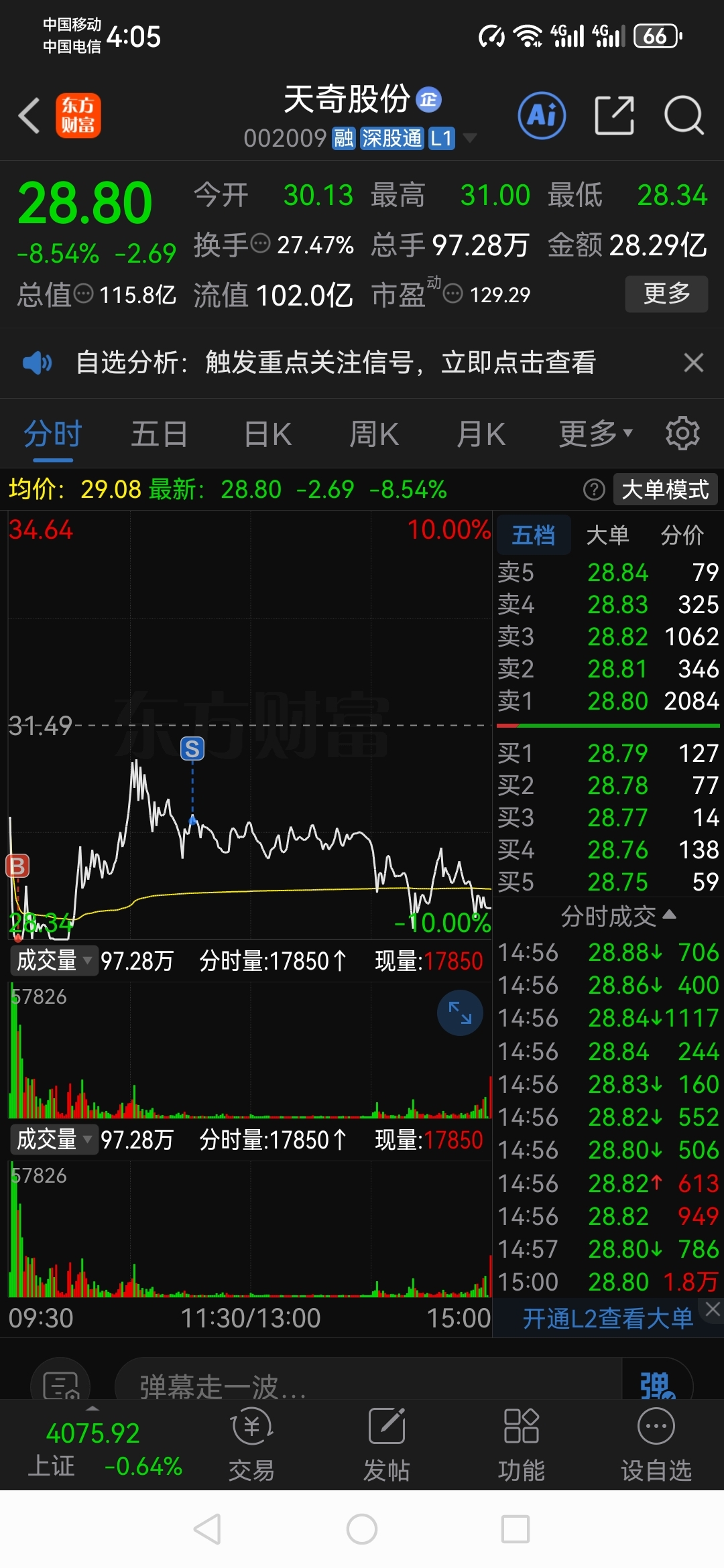 跌停28.35,买了10万,后面十点多还没冲上去,果断卖掉了一半,刘半枪观望,今