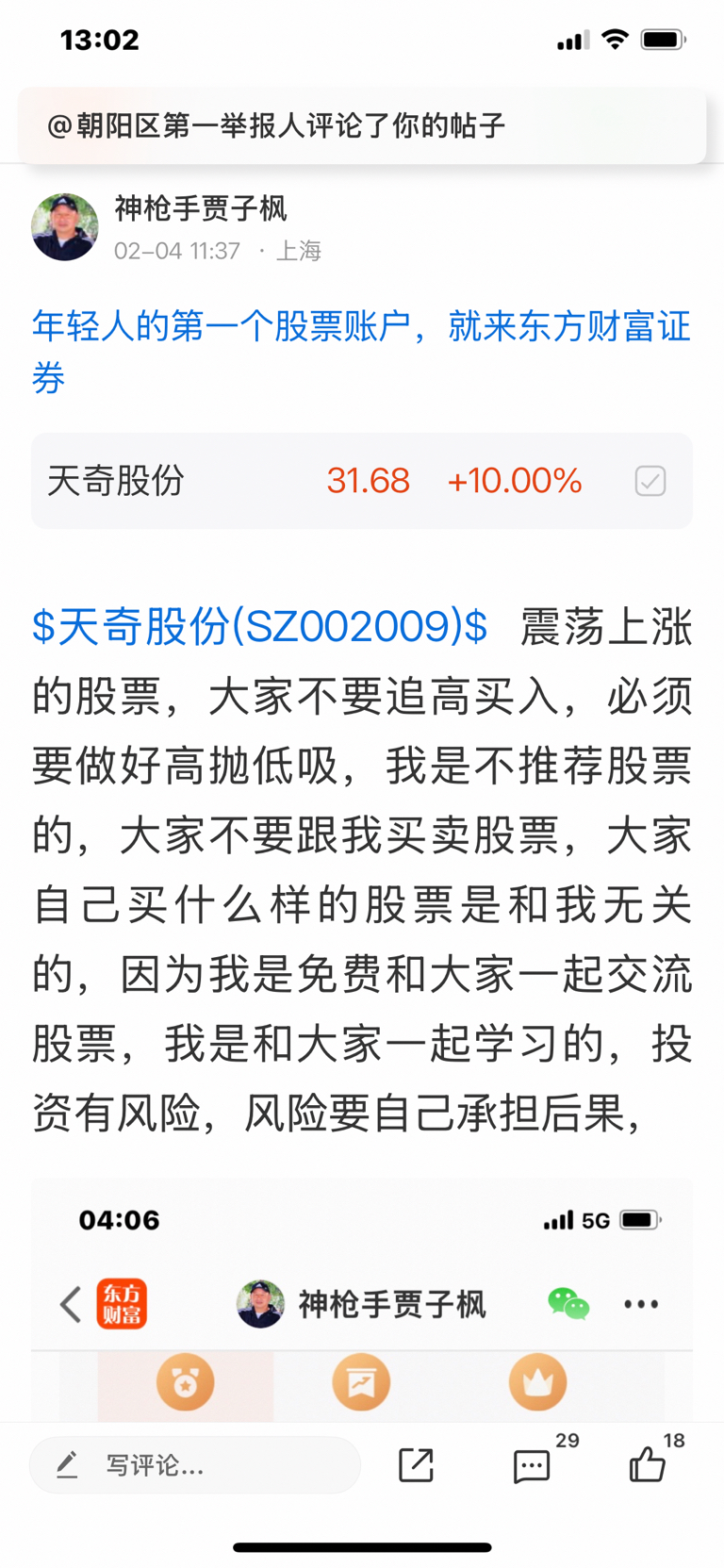 $天奇股份(SZ002009)$ 这个是二月四号发表看涨的股票,大家不要追高买入,必须要做好高抛低吸,我是不推荐股票的,大家不要跟我买卖股票,大家自己买什么样的股票是和我无关的,因为我是免费和大家一起交流股票,我是和大家一起学习的,我的观点仅供参考,投资有风险,风险要自己承担后果,