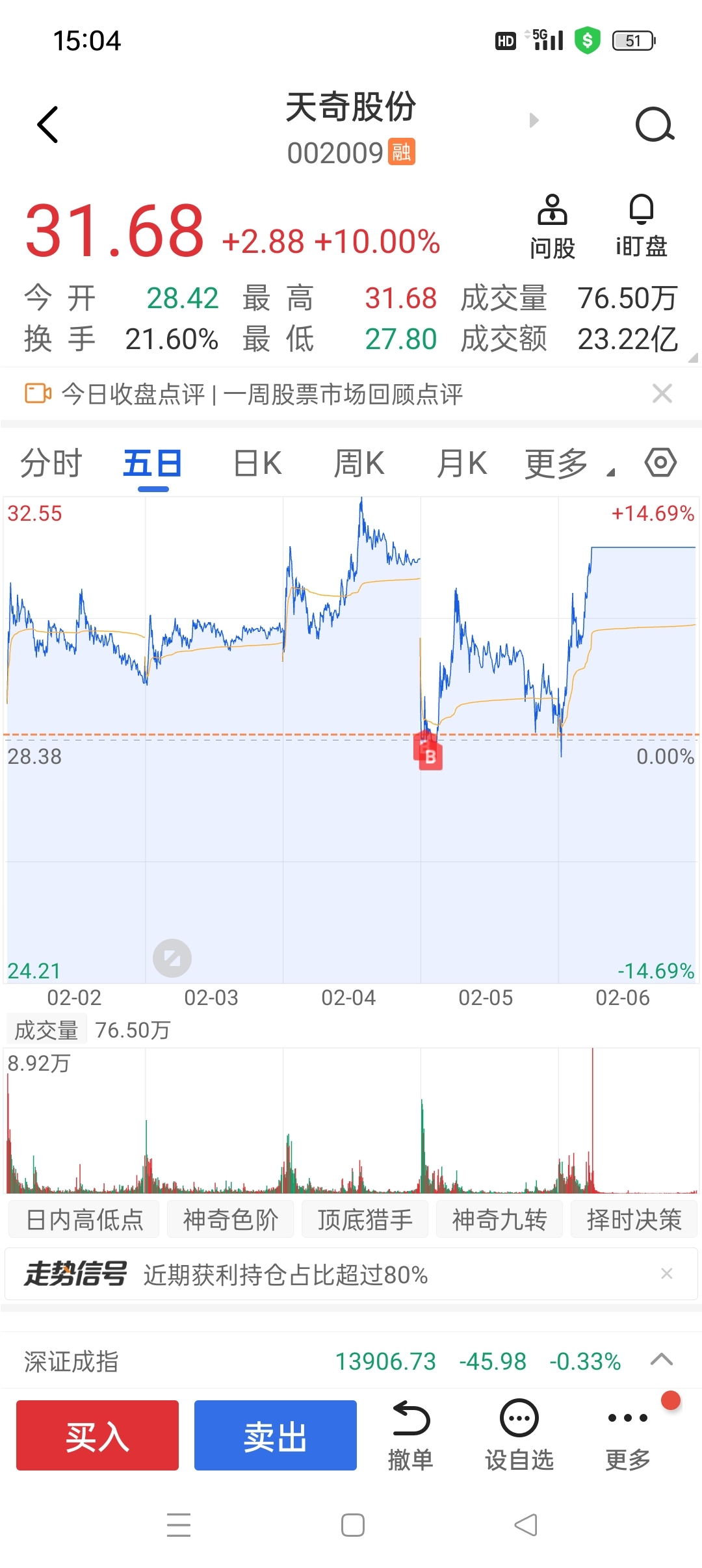 $天奇股份(SZ002009)$ 天奇股份(002009)2026年2月6日收盘封单量5,784.88万股,封单金额18.33亿元,封成比0.21,封单占实际流通盘16.06%,占当日成交量75.62%。当日10:28封板后未开板。恭喜留下的兄弟,下周接着吃肉