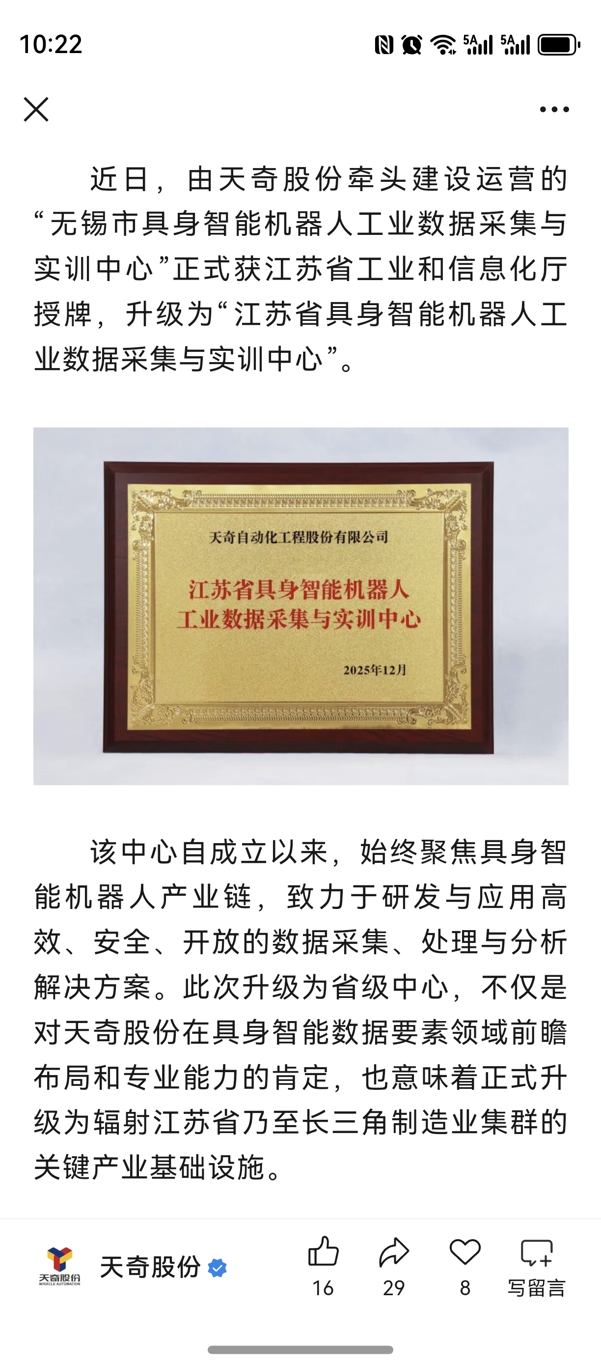 $天奇股份(SZ002009)$ 由天奇股份牵头建设运营的具身智能机器人工业数据采集与实训中心先是升级为“无锡市具身智能机器人工业数据采集与实训中心”,然后又正式获得江苏省工业和信息化厅授牌,升级为“江苏省具身智能机器人工业数据采集与实训中心”。连生两级