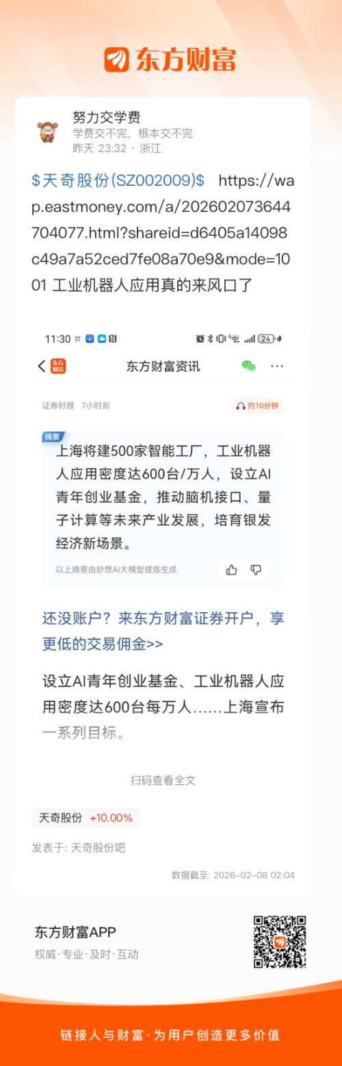 $天奇股份(SZ002009)$ https://wap.eastmoney.com/a/202602073644704077.html?shareid=d6405a14098c49a7a52ced7fe08a70e9&mode=1001 工业机器人应用真的来风口了