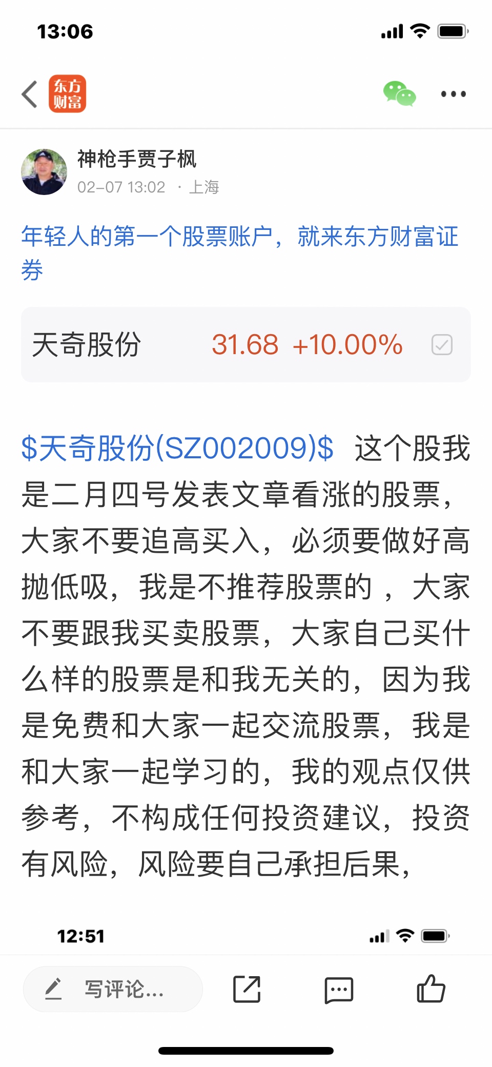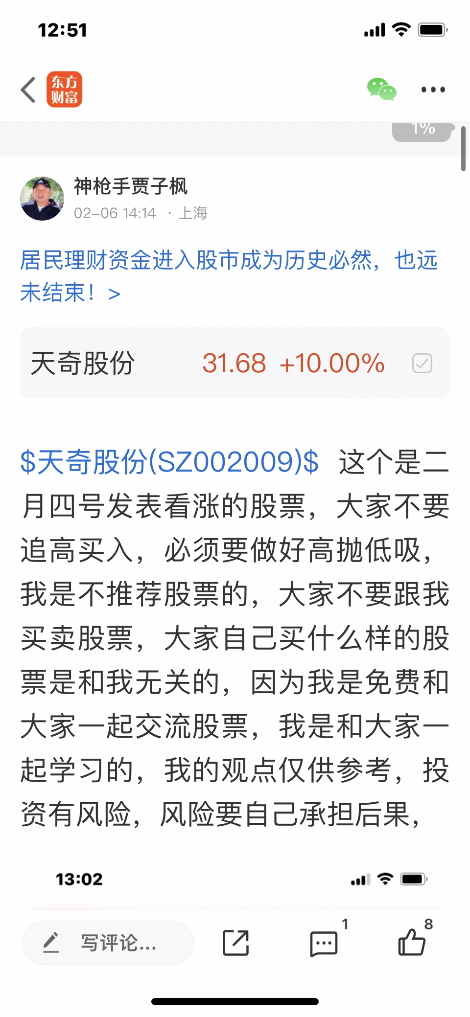$天奇股份(SZ002009)$ 这个股是我二月四号发表文章看涨的股票,大家不要追高买入,必须要做好高抛低吸,我是不推荐股票的,大家不要跟我买卖股票,大家自己买什么样的股票是和我无关的,因为我是免费和大家一起交流股票,我是和大家一起学习的,我的观点仅供参考,不构成任何投资建议,投资有风险,风险要自己承担后果,