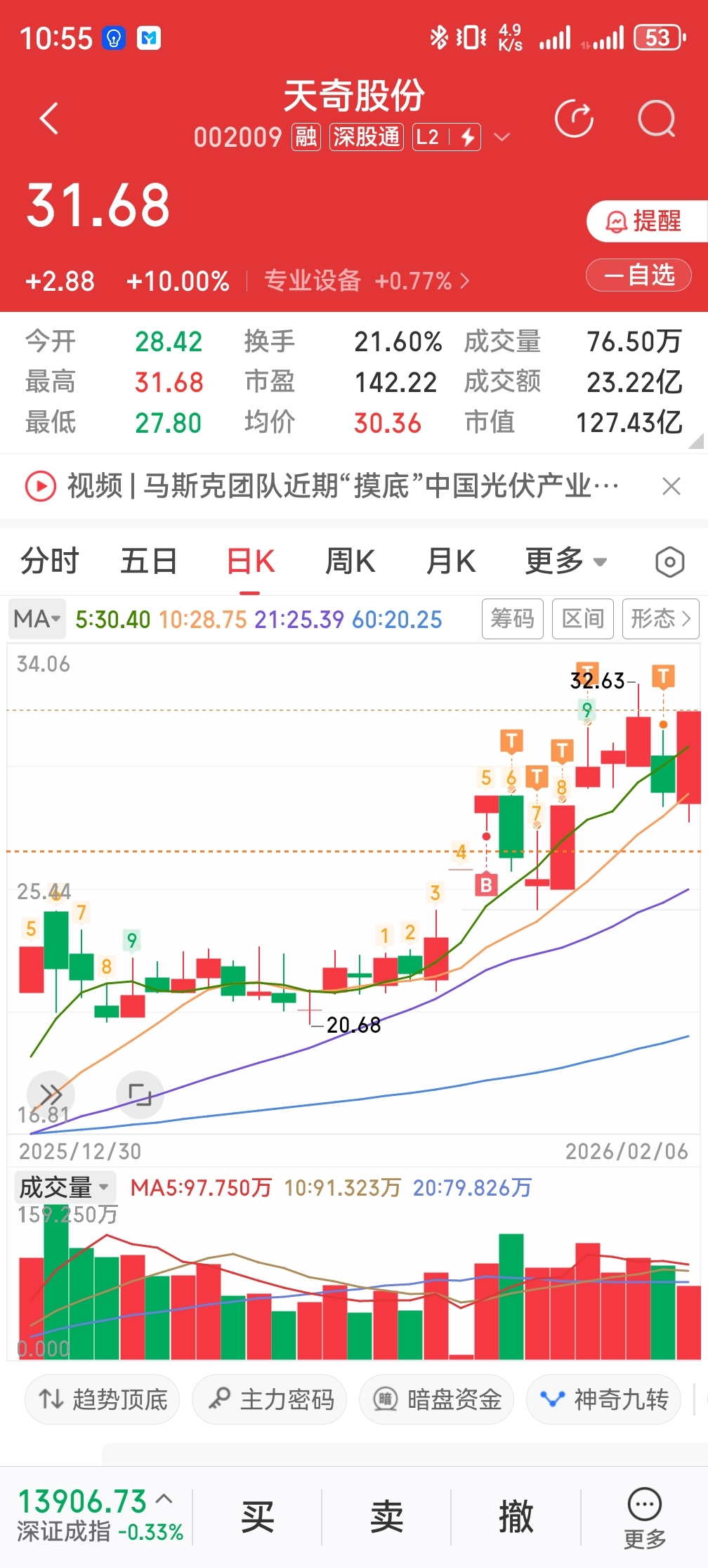 天奇股份也是跟大家一样都知道春晚的事,持仓也不少天了,利润比较薄十几个点,主力周五强势封板也是给我吃了定心丸,明天会怎么走,是加速,还是继续震荡等春节后题材发酵膨胀再加速,主力压这么久相信也是希望这个股能走的更长,身为腰斩腰斩三十多的老韭菜,迷茫明天会怎么走。求解惑。