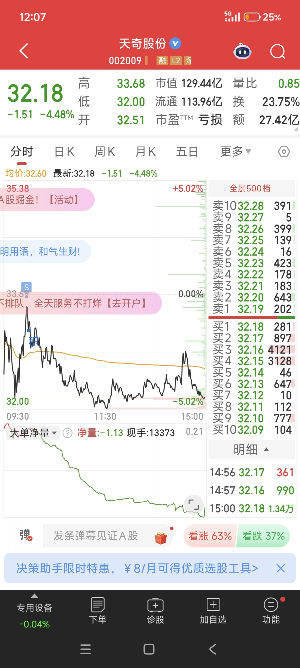 $天奇股份(SZ002009)$ 昨天32.01买的,第一次挂33.68没出去,因为到了68就砸盘,第二次拉直接66砸盘清仓