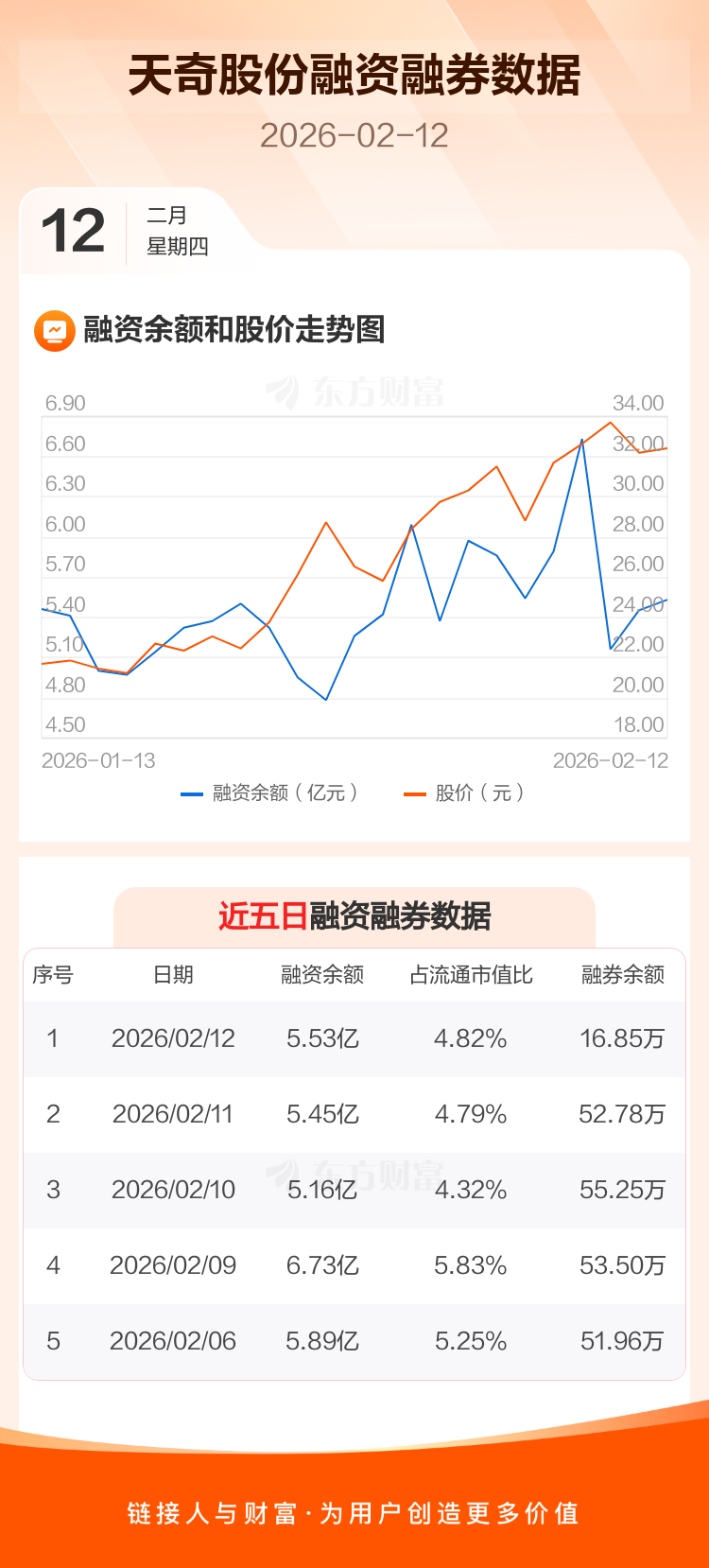 交易所最新数据显示,天奇股份于2026年2月12日获融资买入1.70亿元,融资偿还1.63亿元,当日融资净买入736.9万元。目前,该股融资余额5.53亿,占流通市值比例为4.82%。