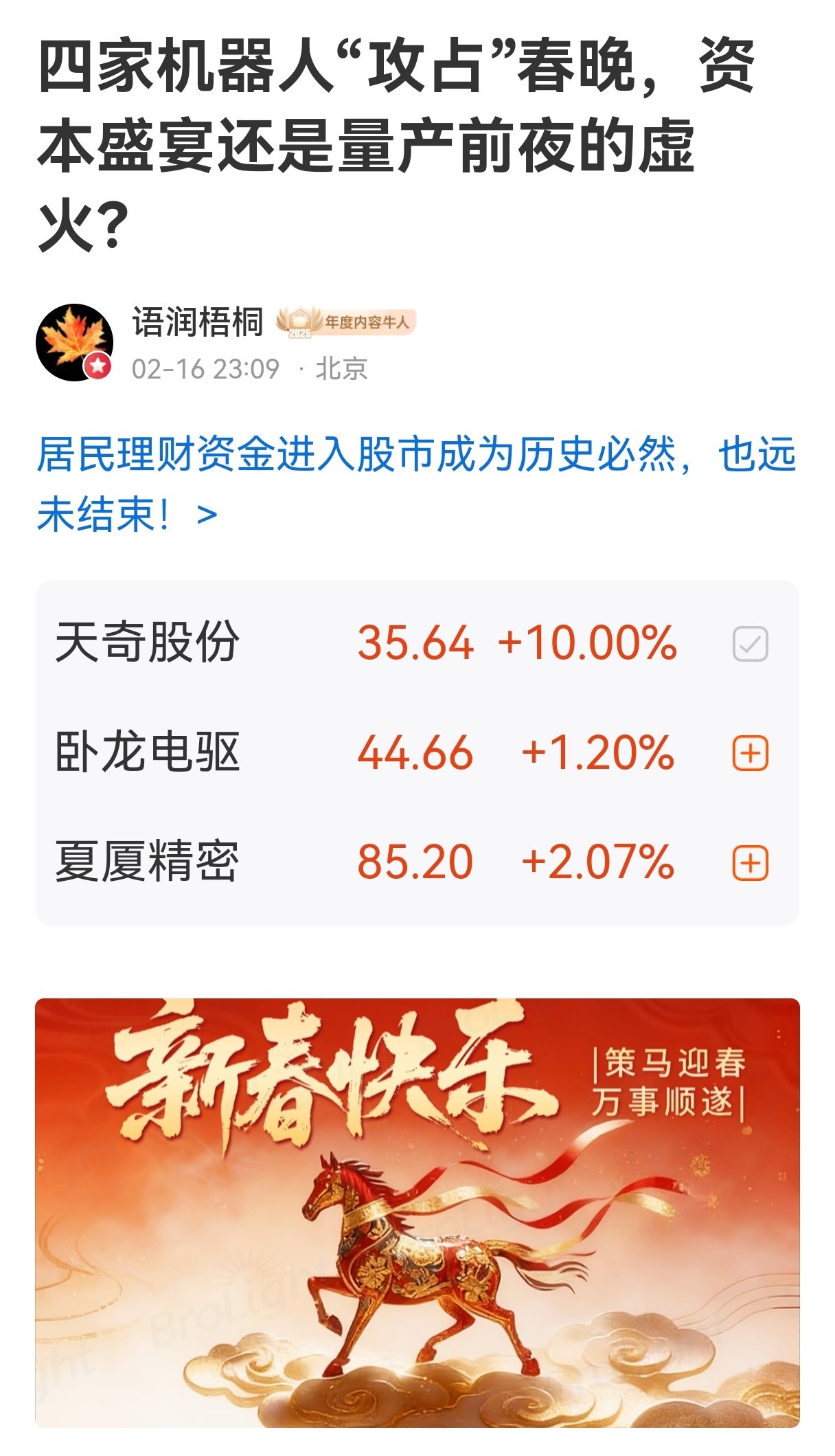 #股友热议!春晚背后投资机会一览#  #2026春节见闻#  #社区牛人计划#  #盘逻辑:深度解析,理清投资思路#  #说故事:聊炒股见闻,品投资人生#  $天奇股份(SZ002009)$  $利亚德(SZ300296)$  $卧龙电驱(SH600580)$  @社区精选   @东方财富创作小助手   @股吧话题