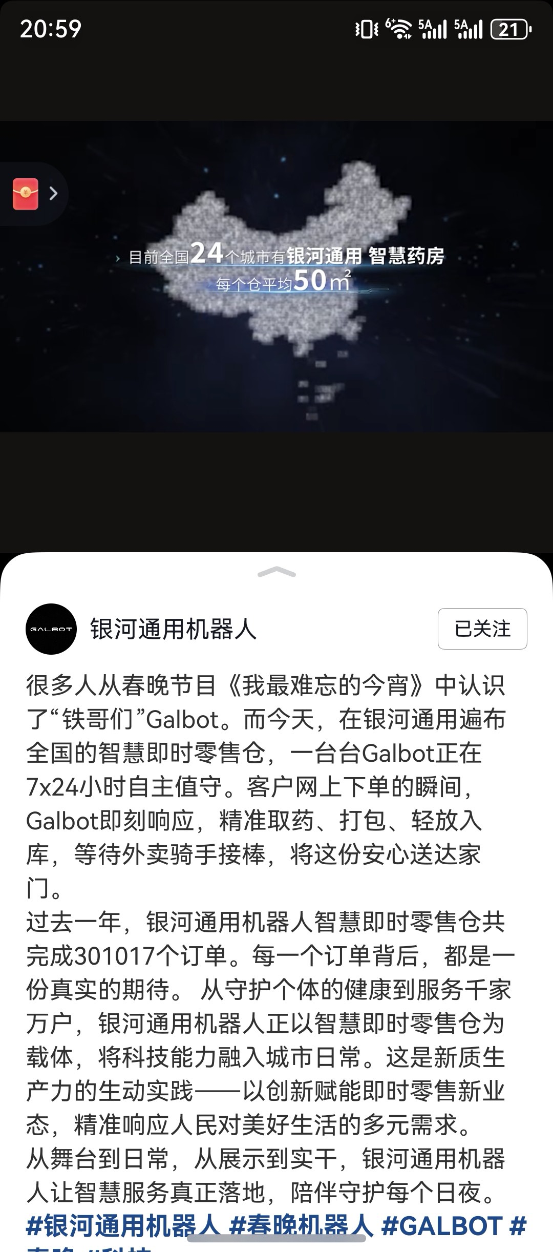银河通用具身智能+人民日报报道+央视春晚站台+飞驰人生合作。