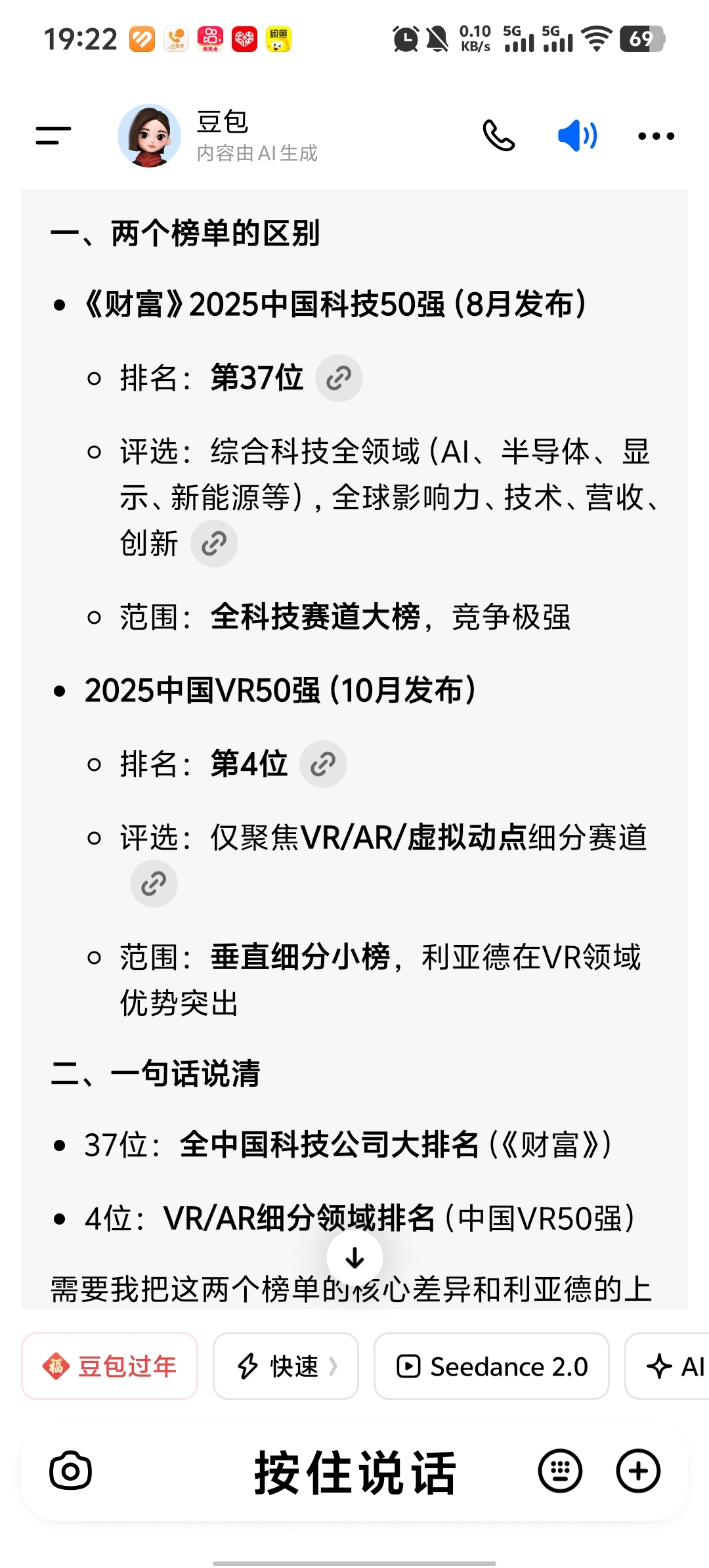 利亚德是2025中国科技50强第37位,也是2025中国VR50强第四位,这样的