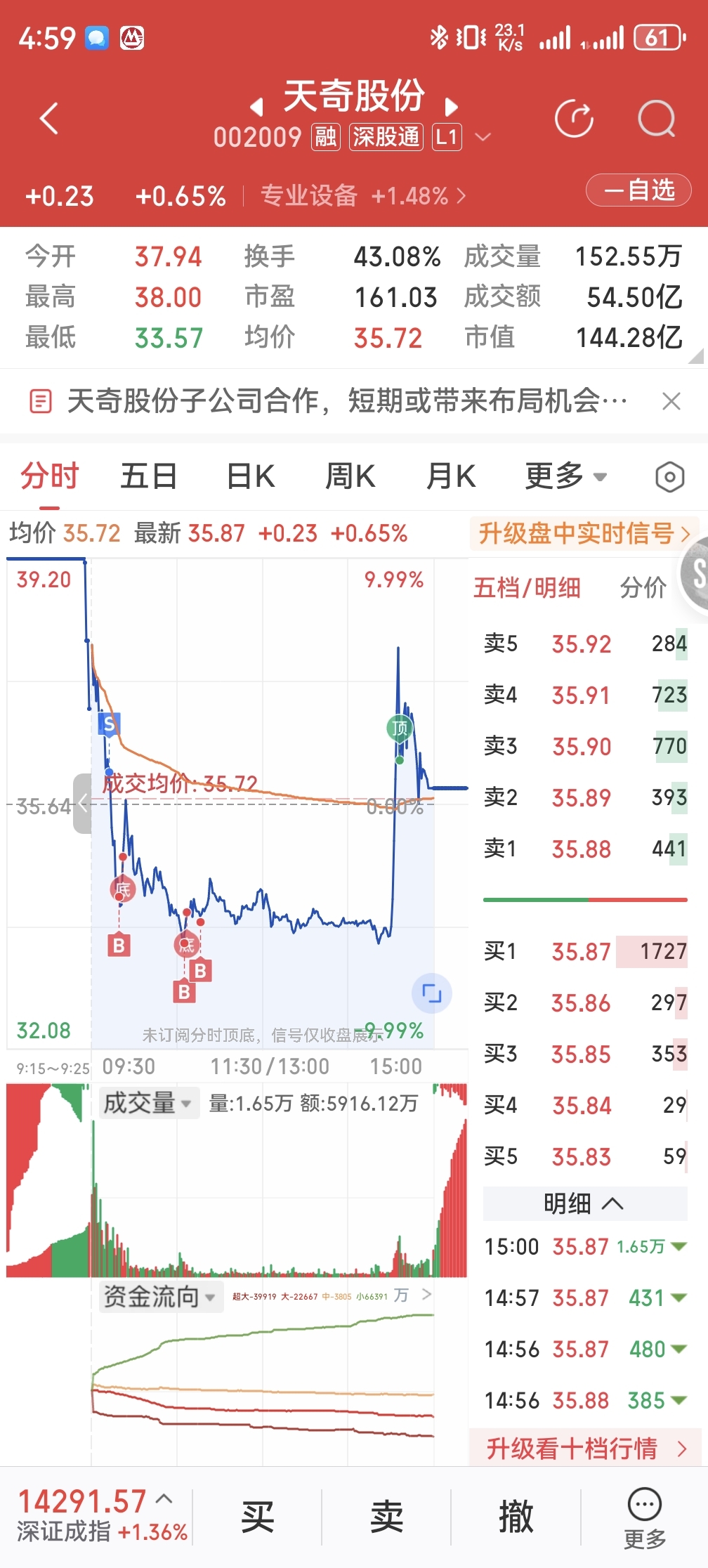 新年第一天,可能大家都预期一字板,所以主力不能让我们一字板,开盘就一顿猛砸,等我反应过来已经很迟,果断一键清仓,想了又想,水下5-6个点个筹码买回来一大半,总结,个人感觉主力在洗盘,天奇整体走势不是加速,而是缓慢上涨趋势,又涨停必定要洗盘,让获利盘早走,新的人员来参与,这样获利盘就比较小,为再次拉升减少抛压,个人观点。