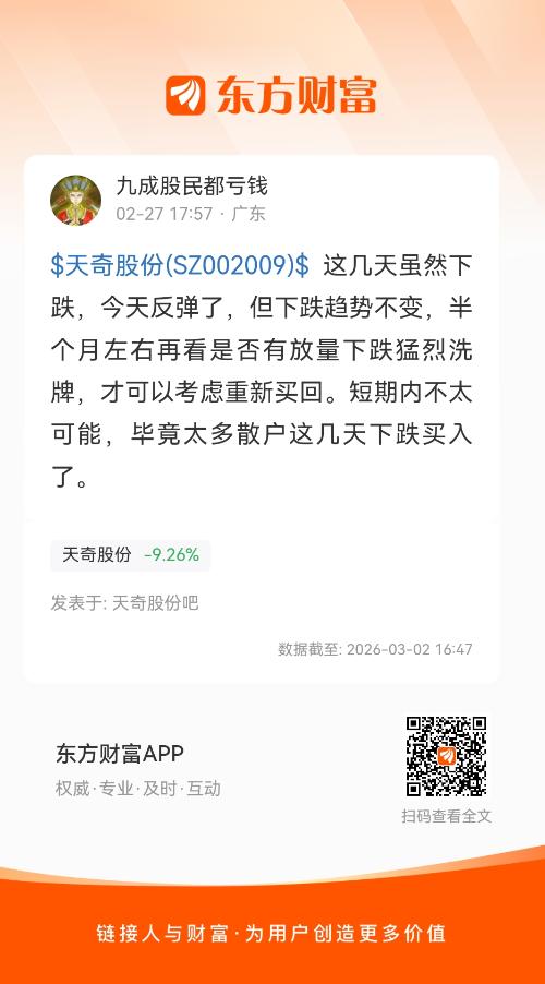 $天奇股份(SZ002009)$ 这几天虽然下跌,今天反弹了,但下跌趋势不变,半个月左右再看是否有放量下跌猛烈洗牌,才可以考虑重新买回。短期内不太可能,毕竟太多散户这几天下跌买入了。