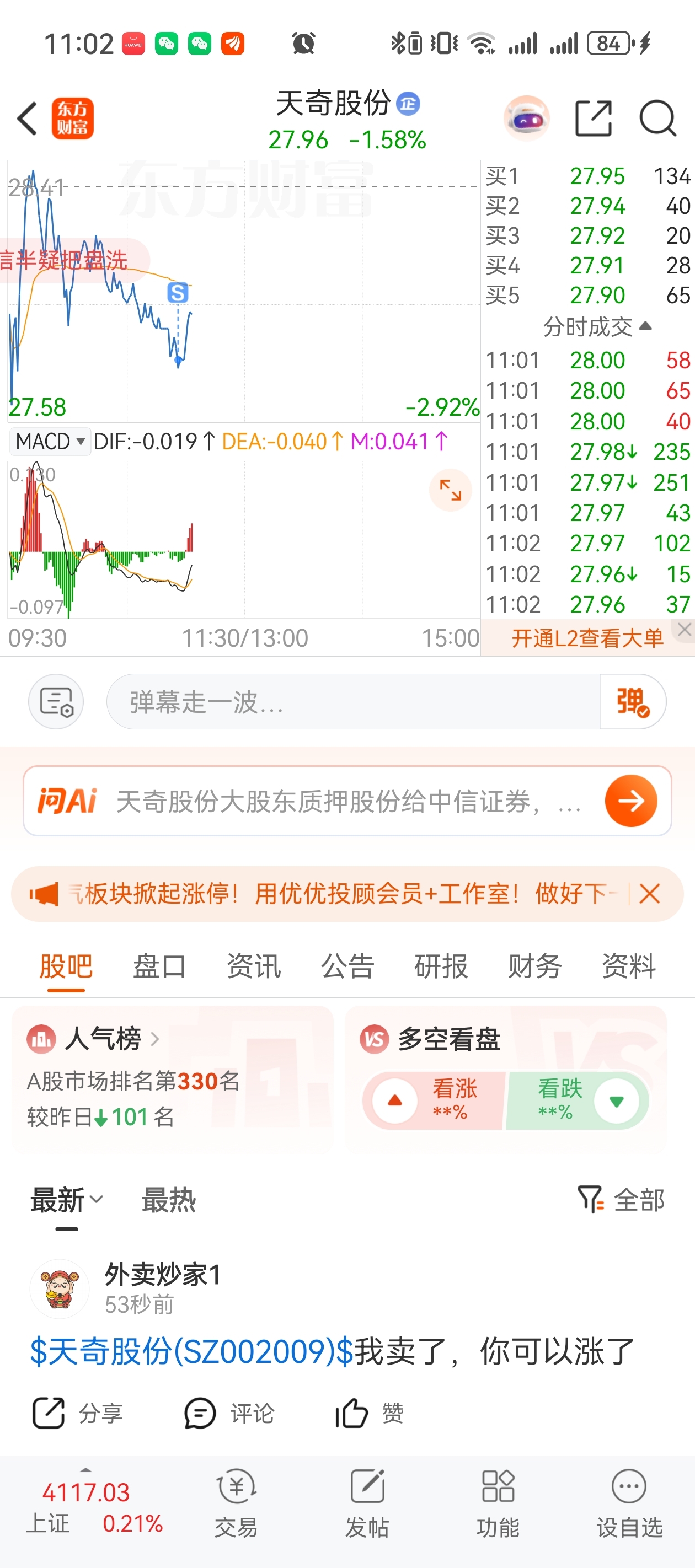 $天奇股份(SZ002009)$ 快来谢谢我