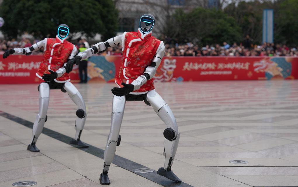 2026年,宇树科技人形机器人在浙江省桐庐县中心广场表演舞蹈。新华社记者黄宗治摄