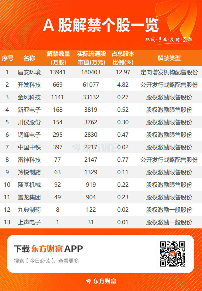 【明日解禁】明日13股解禁 盾安环境、开发科技解禁市值居前