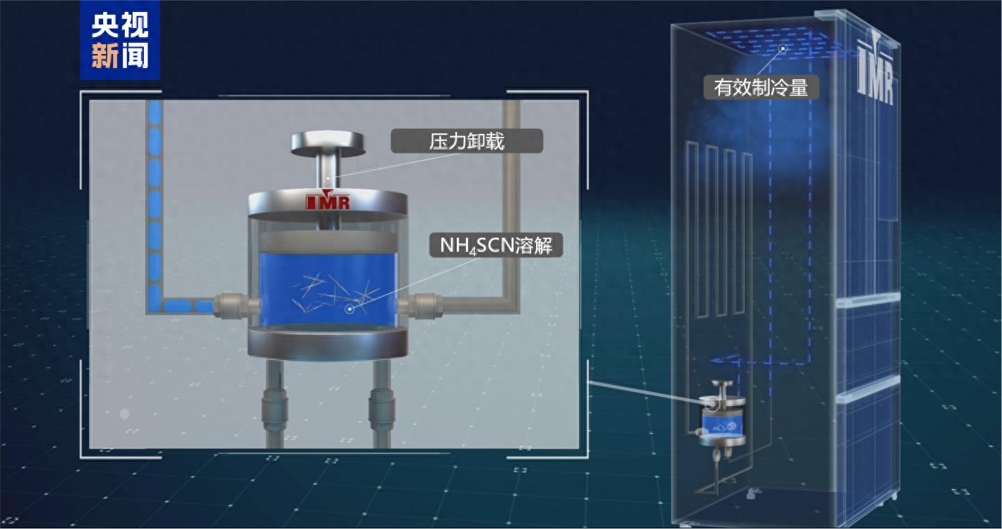 算力作为数字经济时代的关键基础设施,其高速发展背后是日益增长的能源消耗与散热需求。数据中心的冷却系统能耗占数据中心总用电的近40%,传统压缩机制冷方案不仅能耗大、排放高,且在应对高功率散热需求时面临换热效率瓶颈。研究团队在实验中发现,硫氰酸铵(NH₄SCN)溶液在压力变化下可以表现出惊人的热效应:加压时盐析出并放热,卸压后盐迅速溶解并强力吸热,室温下溶液温度可在20秒内骤降近30℃,在高温环境下降温幅度更大,远超已知固态相变材料性能。这一现象被命名为“溶解压卡效应”。该效应将制冷工质与换热介质合二为一:利用溶液本身流动性实现高效传热,同时通过溶解、析出过程提供巨大冷量,从而打破了长期以来困扰制冷领域的“低碳-大冷量-高换热”不可能三角关系。