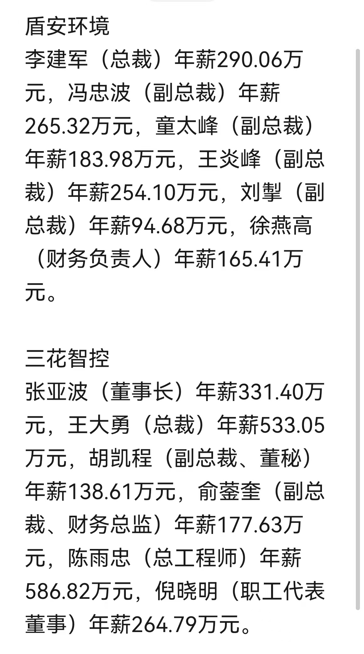 $盾安环境(SZ002011)$ 上市公司高管的薪酬待遇高,说明公司经营效益好!从三花智控与盾安环境二家公司高管的年薪比较,伯仲之间!都很牛X。