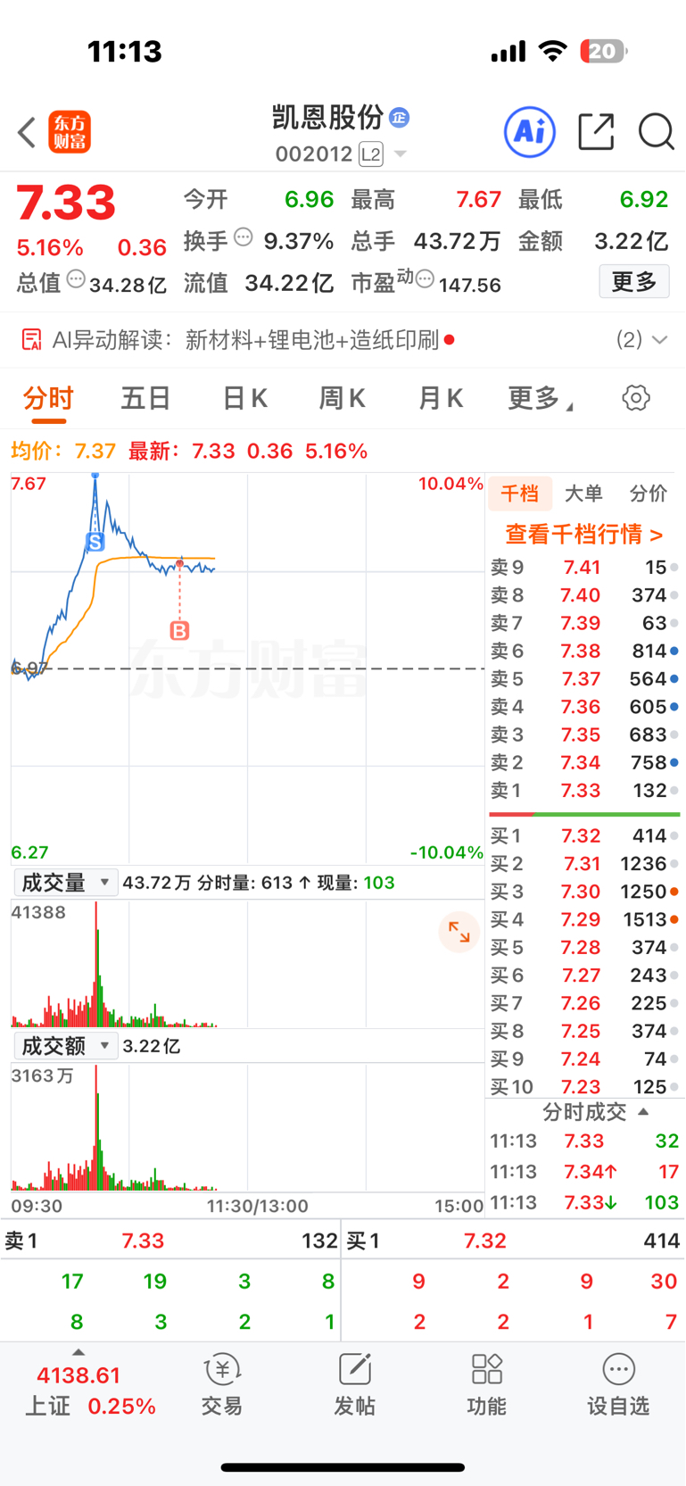 $凯恩股份(SZ002012)$ 上班挂涨停直接被吃了,休息抽根烟又看到了 继续格局,看好凯恩,爱你凯恩大帝