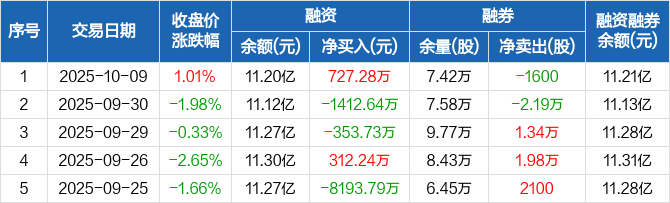 融资方面,当日融资买入4796.49万元,融资偿还4069.21万元,融资净买入727.28万元。融券方面,融券卖出3700股,融券偿还5300股,融券余量7.42万股,融券余额88.89万元。融资融券余额合计11.21亿元。